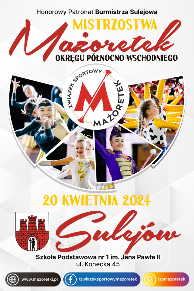 Już w najbliższą sobotę, (20.04) w gminnej hali sportowej w Sulejowie, przy Szkole Podstawowej im. Jana Pawła II przy ulicy Koneckiej 45, odbędą się Mistrzostwa Mażoretek Okręgu Północno-Wschodniego. Obroty, spektakularne figury i dopracowane w najdrobniejszych szczegółach układy będzie można oglądać od godziny 8:00 do 22:00.