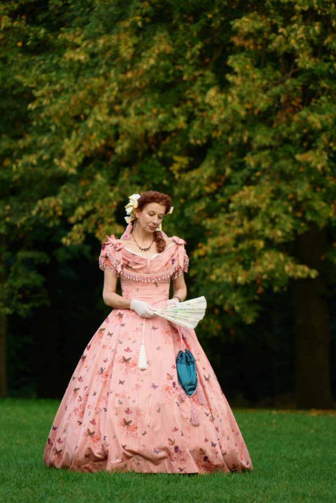 – Nie policzyłam i ciężko mi zliczyć suknie, które powstały w mojej pracowni. Moda kobieca zmieniała się w dziewiętnastym wieku wielokrotnie, mniej więcej co dziesięć lat. Ewoluowały proporcje i sylwetka, wędrowała linia talii, raz była niżej raz wyżej od talii naturalnej, zmieniała się objętość spódnic, w 1856 roku wynaleziona została krynolina. Za tymi częstymi zmianami szły dodatki, fryzury, biżuteria, buty. To olbrzymie pole do popisu dla rekonstruktorek. Zaprojektowałam i uszyłam strój na prawie każdy z modowych okresów dziewiętnastego wieku. Choć dopiero teraz będę szyła dla siebie suknię z okresu pierwszej turniury, czyli z 1874 roku, z tyłem upiętym w charakterystyczną draperię. Projektuję też historyczne druki i odtworzyłam już kiedyś wzory z tego datowania. Od lat współpracuję z drukarniami, odtwarzając druki z historycznych sukien, aby móc jak najdokładniej odzwierciedlić to, co uda mi się znaleźć w źródłach – opowiada pani Ewa i dodaje, że praca nad każdą rekonstrukcją to wieloetapowy proces.