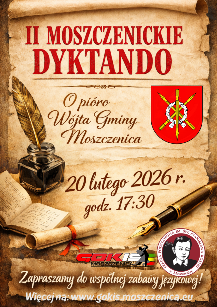 Już dziś (20.02) o godzinie 17:30 gmina Moszczenica ponownie stanie się stolicą poprawnej polszczyzny. Wszystko za sprawą II Moszczenickiego Dyktanda o Pióro Wójta Gminy Moszczenica, które odbędzie się w Gminnym Ośrodku Kultury i Sportu w Moszczenicy.