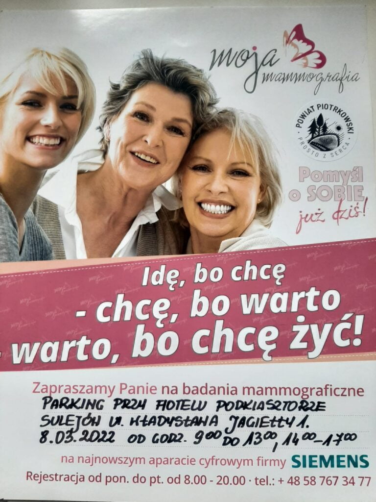 – Zdrowie jest najważniejsze! Jest to ogromna wartość, która jak doskonale wiemy, nie jest nam dana raz na zawsze. Dlatego właśnie z okazji Dnia Kobiet, zapraszamy wszystkie Was na badanie piersi. 8 marca na parkingu przy naszym hotelu, zatrzyma się Mammobus, w którym wszystkie będzie można się zbadać. Zabierz swoją mamę, córkę, przyjaciółkę czy sąsiadkę i zrób sobie prezent z okazji swojego święta. – zachęca Julia Groblewska z Hotelu Podklasztorze.