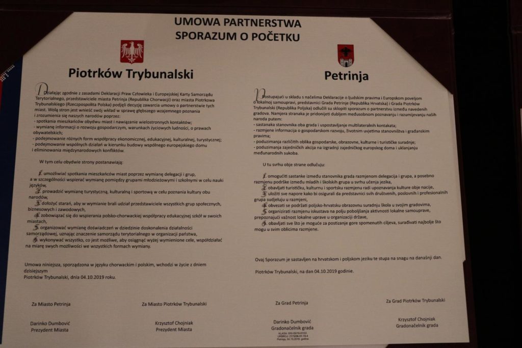 „Działając zgodnie z zasadami Deklaracji Praw Człowieka i Europejskiej Karty Samorządu Terytorialnego, przedstawiciele miasta Petrinja (Republika Chorwacji) oraz miasta Piotrkowa Trybunalskiego (Rzeczpospolita Polska) podjęli decyzję zawarcia umowy o partnerstwie tych miast” – brzmi preambuła do umowy partnerskiej, którą sygnowali włodarze obu miast.