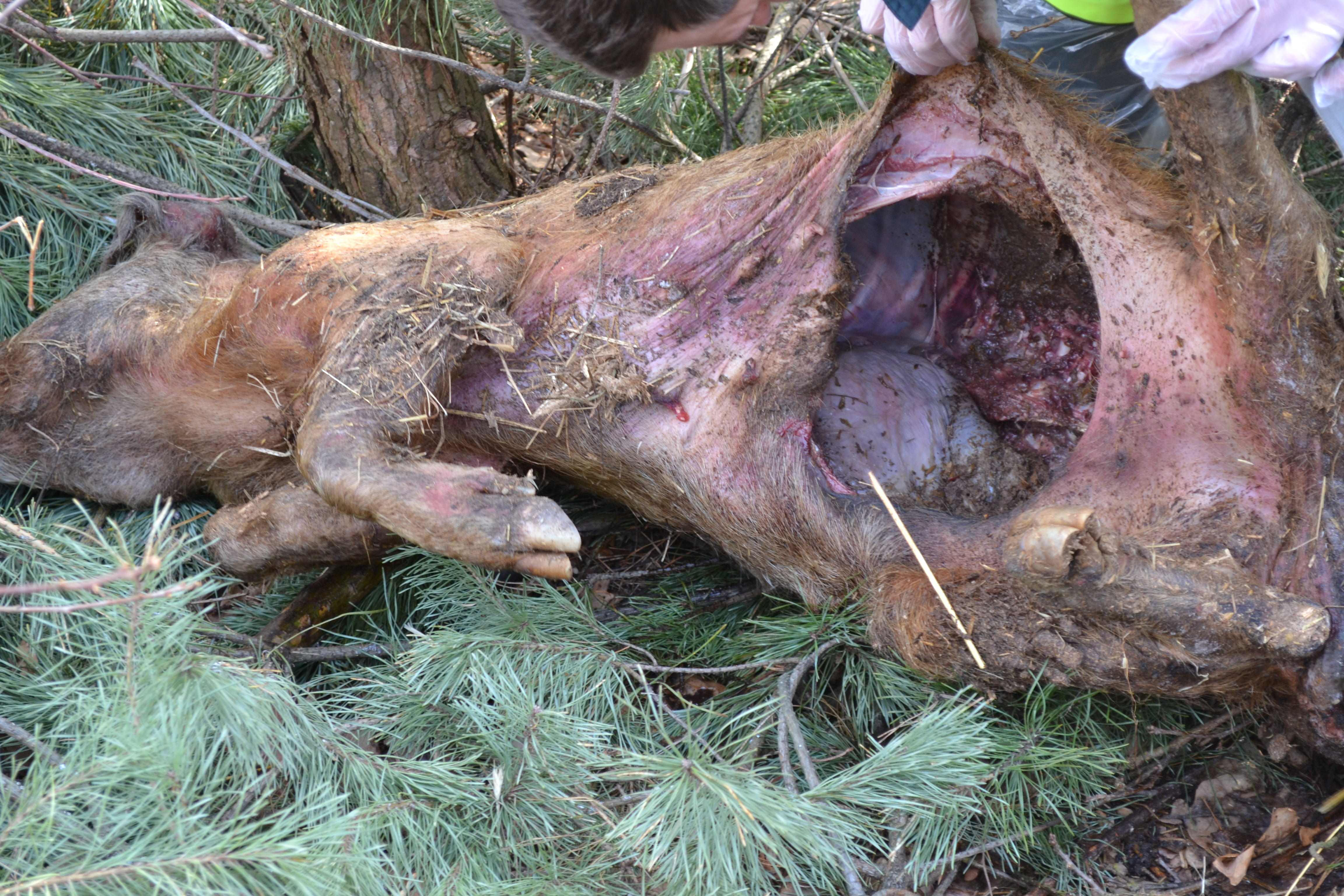Zwłoki świni znaleziono we wsi Nowinki w gminie Ręczno. Anonimowa osoba, która znalazła zwierze, powiadomiła o tym Urząd Gminy, a urzędnicy Powiatowego Lekarza Weterynarii. Przybyli na miejsce policjanci ustalili właściciela padłej świni.