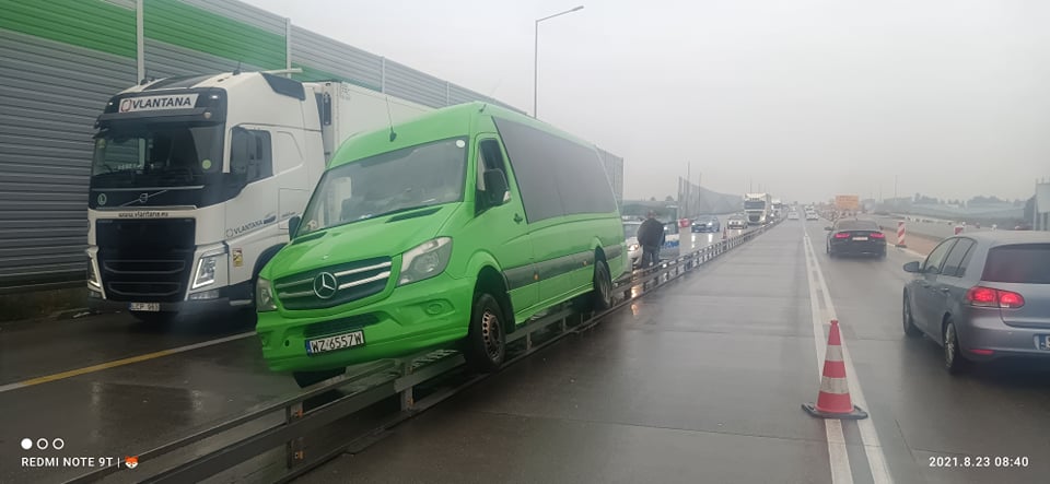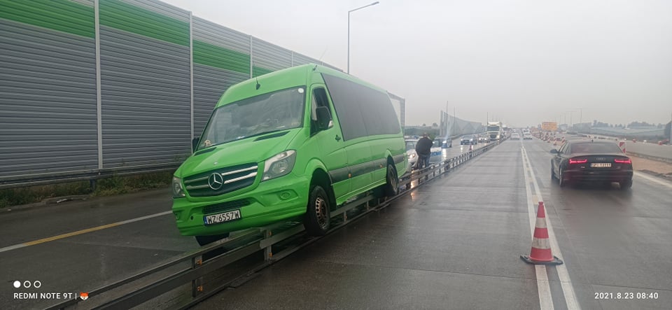 Do nietypowego zdarzenia doszło w poniedziałek rano w okolicach węzła „bełchatowskiego”. Kierowca mercedesa sprintera najechał na bariery energochłonne i zawisł na nich. Na szczęście nie ma osób rannych.