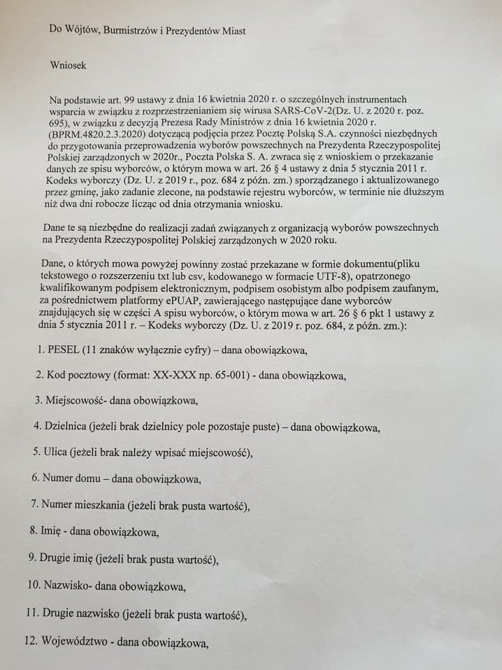 Poczta Polska przesłała od Urzędu Miasta wniosek o przekazanie spisu wyborców. Państwowy operator pocztowy chce, by samorząd udostępnił oprócz imienia i nazwiska, numer PESEL i dokładny adres zamieszkania. Anonimowy mail, podpisany jedynie „Z wyrazami szacunku, Poczta Polska” trafił do piotrkowskiego magistratu około 2:30 w nocy w czwartek 23 kwietnia. Poczta, na przekazanie danych dała miasto dwa dni. – Na tę chwilę, nie mamy podstaw prawnych by przekazać Poczcie spis wyborców – powiedział w rozmowie z naszym reporterem Bogdan Munik, sekretarz miasta.