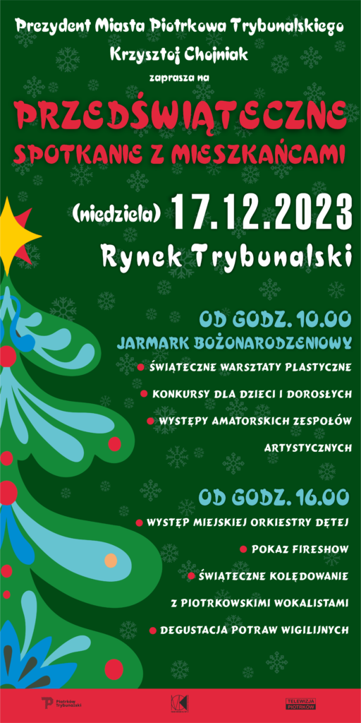 O godz. 16.00 zaplanowano koncert Miejskiej Orkiestry Dętej, po którym prezydent Krzysztof Chojniak złoży życzenia mieszkańcom naszego miasta. Przewidziano także pokaz fireshow oraz wspólne kolędowanie z piotrkowskimi wokalistami. Niewątpliwą atrakcją będzie karuzela, która stanie na płycie Rynku.  Na przybyłych czekał będzie również symboliczny poczęstunek wigilijny.  Szczegóły na plakacie poniżej.