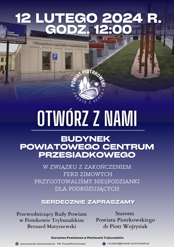Starosta Powiatu Piotrkowskiego Piotr Wojtysiak i Przewodniczący Rady Powiatu Piotrkowskiego Bernard Matyszewski serdecznie zapraszają na uroczyste zakończenie budowy Powiatowego Centrum Przesiadkowego Piotrków Trybunalski. W uroczystości weźmie także udział Minister Infrastruktury Dariusz Klimczak.