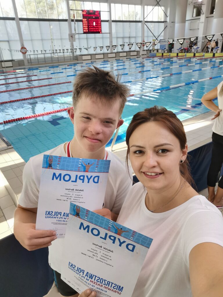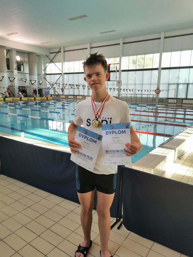 W zmaganiach wziął udział także mieszkaniec Piotrkowa Trybunalskiego Bartosz Sokalski, który zdobył dwa złote medale. W mistrzostwach wzięło udział 70 najlepszych zawodników z całej Polski. Do zawodów zakwalifikował się również piotrkowianin Bartosz Sokalski, który wywalczył dwa złote medale w swojej kategorii wiekowej: – na dystansie 25 metrów stylem dowolnym, wyprzedzając swojego rywala zaledwie o 0:00:26 s oraz na dystansie 25 metrów stylem grzbietowych, ponownie wygrywając tym razem o 00:00:60 s. Jak podkreśla Bartosz: – O moim zwycięstwie zdecydowały dosłownie ułamki sekund, nie opuścił mnie duch rywalizacji, a intensywne przygotowania w ostatnich tygodniach zebrały swoje żniwo. Bartosz swoją przygodę z pływaniem zaczął 5 lat temu pod okiem fizjoterapeuty pani Anny Matery. Wówczas zajęcia na basenie zaczęły mieć formę zajęć rehabilitacyjnych mających na celu rozwijanie koordynacji wzrokowo – ruchowej i ogólnej sprawności fizycznej. Szybko okazało, że podczas tych zajęć chłopak czuje się, jak ryba w wodzie, a pozyskiwanie nowych umiejętności w środowisku wodnym przychodzi mu z niebywałą łatwością. Dodatkowo, sprawiając dużą przyjemność i co bardzo ważne – w ogromnym stopniu poprawiając jego ogólną sprawność fizyczną, wydolność organizmu i koordynację całego ciała. Z czasem więc zajęcia w sposób naturalny zaczęły mieć charakter treningów rozwijających umiejętności pływania wszystkimi stylami. Dziś młody mieszkaniec Piotrkowa trenuje pod okiem dwóch instruktorów kilka razy w tygodniu. Oprócz zajęć indywidualnych w fizjopracowni pod okiem instruktorki i fizjoterapeuty pani Anny Matery, uczęszcza też na zajęcia grupowe do pana Janusza Ciechanowskiego. Na co dzień Bartosza wspierają oczywiście kochający i stale dopingujący rodzice, starszy brat oraz najbliższa rodzina. – Dokonania naszego syna to doskonały dowód na to, że ciężką pracą można osiągnąć wszystko, a pozorne ograniczenia nie są tak naprawdę żadną przeszkodą. Bartosz jest niezwykle zdyscyplinowanym, kulturalnym młodym człowiekiem z ogromną ilością zainteresowań i zamierzeń na przyszłość – mówią dumni rodzice Marzena oraz Tomasz. – Kolejne plany to oczywiście medal na następnych zawodach i rozwijanie nowej pasji, jaką od niedawna są sztuki walki, czyli karate – dopowiada Bartosz. Historia młodego medalisty pokazała, że osoby z dysfunkcjami też mogą rozwijać swoje pasje i zainteresowania, gratulujemy więc Bartoszowi wywalczonego zwycięstwa oraz życzymy dalszych sukcesów w realizacji zamierzonych celów.