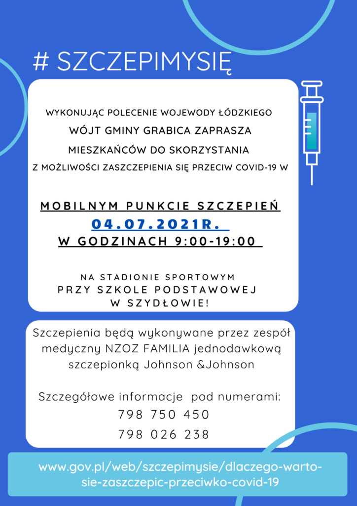 W Szydłowie ustawiony będzie mobilny punkt szczepień. Już niebawem, bo 4 lipca będzie można przyjąć jednodawkową szczepionkę Johnson & Johnson. Punkt czynny będzie od godziny 9:00 do 19:00. Szczegóły na plakatach.