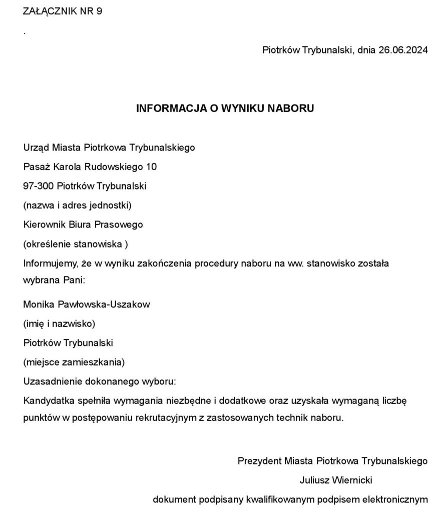 Informacja o ogłoszeniu konkursu pojawiła się w Biuletynie Informacji Publicznej 10 czerwca. W miniony piątek (28.06) ogłoszono wyniki konkursu. W piśmie podpisanym przez prezydenta Juliusza Wiernickiego czytamy, że stanowisko to obejmie Monika Pawłowska-Uszakow. „Kandydatka spełniła wymagania niezbędne i dodatkowe oraz uzyskała wymaganą liczbę punktów w postępowaniu rekrutacyjnym z zastosowanych technik naboru” – głosi komunikat.