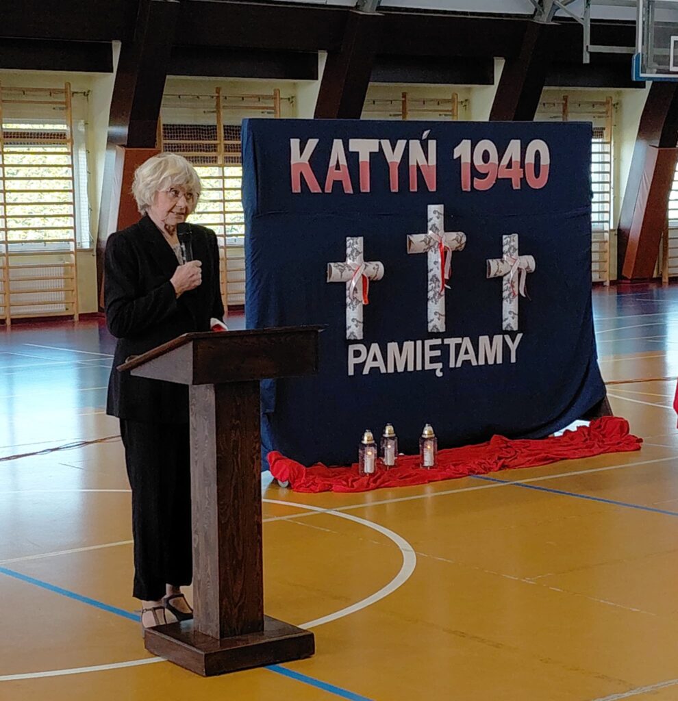Druga część obchodów odbyła się wewnątrz szkoły. Głos zabrała Irena Heinzel, przedstawicielka Rodzin Katyńskich, która poruszyła temat tragicznych losów Polaków zamordowanych w Katyniu, nawiązała również do katastrofy smoleńskiej oraz historii wielokrotnej walk narodu polskiego o niepodległość.