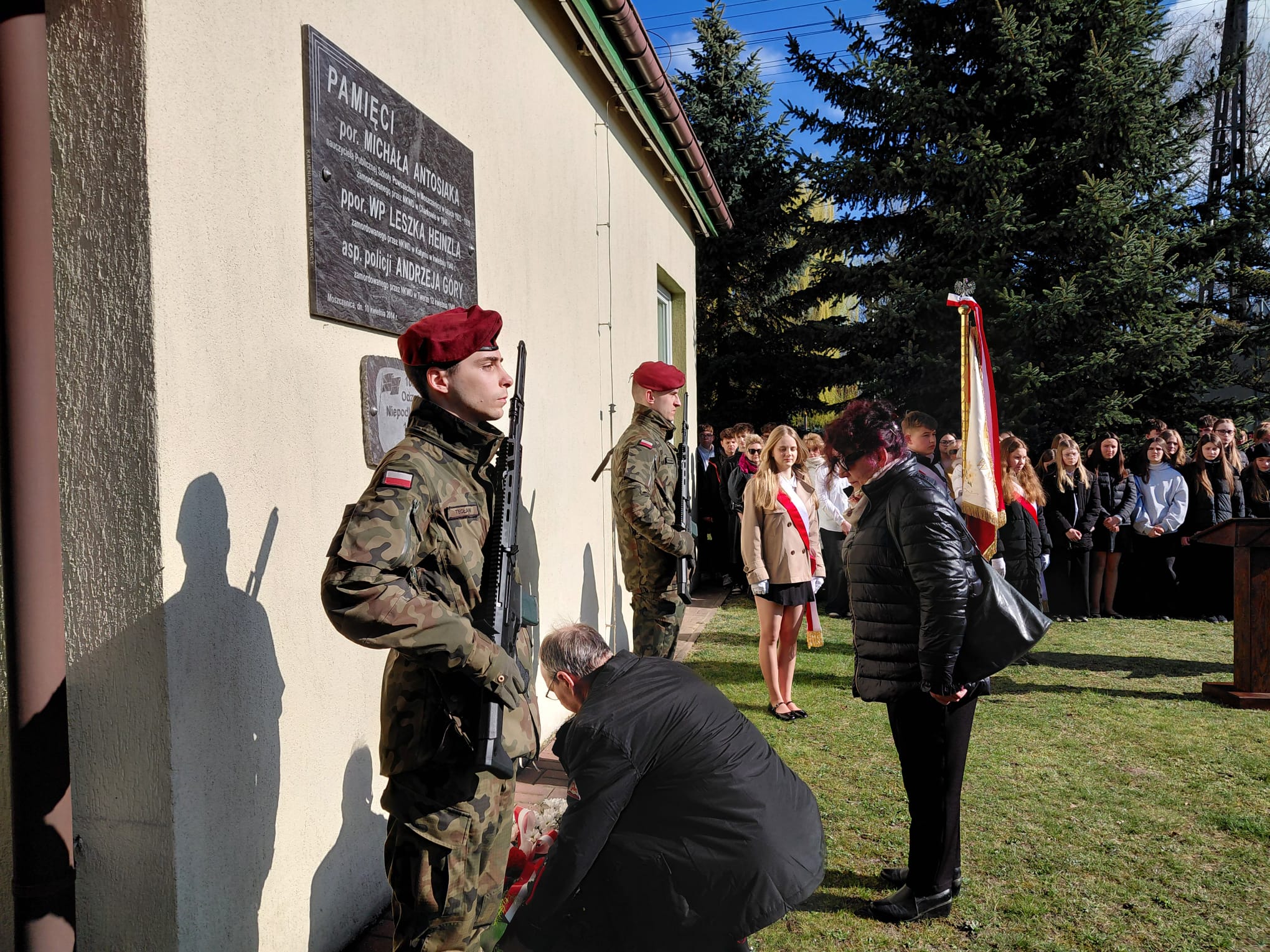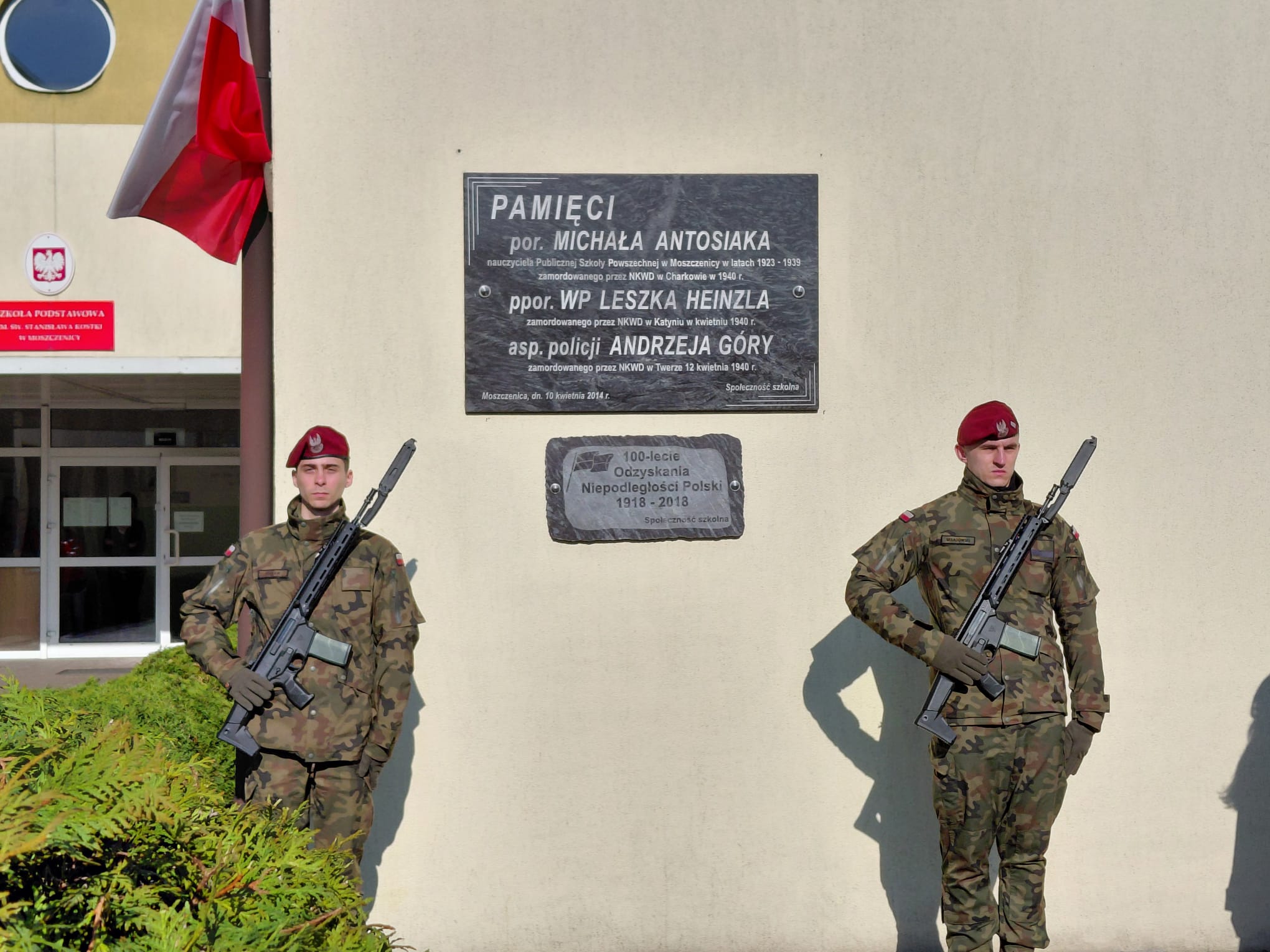 Obchody rozpoczęły się przed budynkiem szkoły, przy tablicy pamiątkowej poświęconej ofiarom zbrodni katyńskiej z terenu gminy Moszczenica: por. Michałowi Antosiakowi, ppor. WP Leszekkowi Heinzlowi oraz asp. policji Andrzejowi Górze. W uroczystości uczestniczyli przedstawiciele władz samorządowych – Wójt Gminy Moszczenica Dariusz Magacz oraz Przewodnicząca Rady Gminy Moszczenica Iwona Jarosińska wraz z radnymi, zaproszeni goście, w tym rodziny ofiar z 1940 roku, a także uczniowie i nauczyciele.
