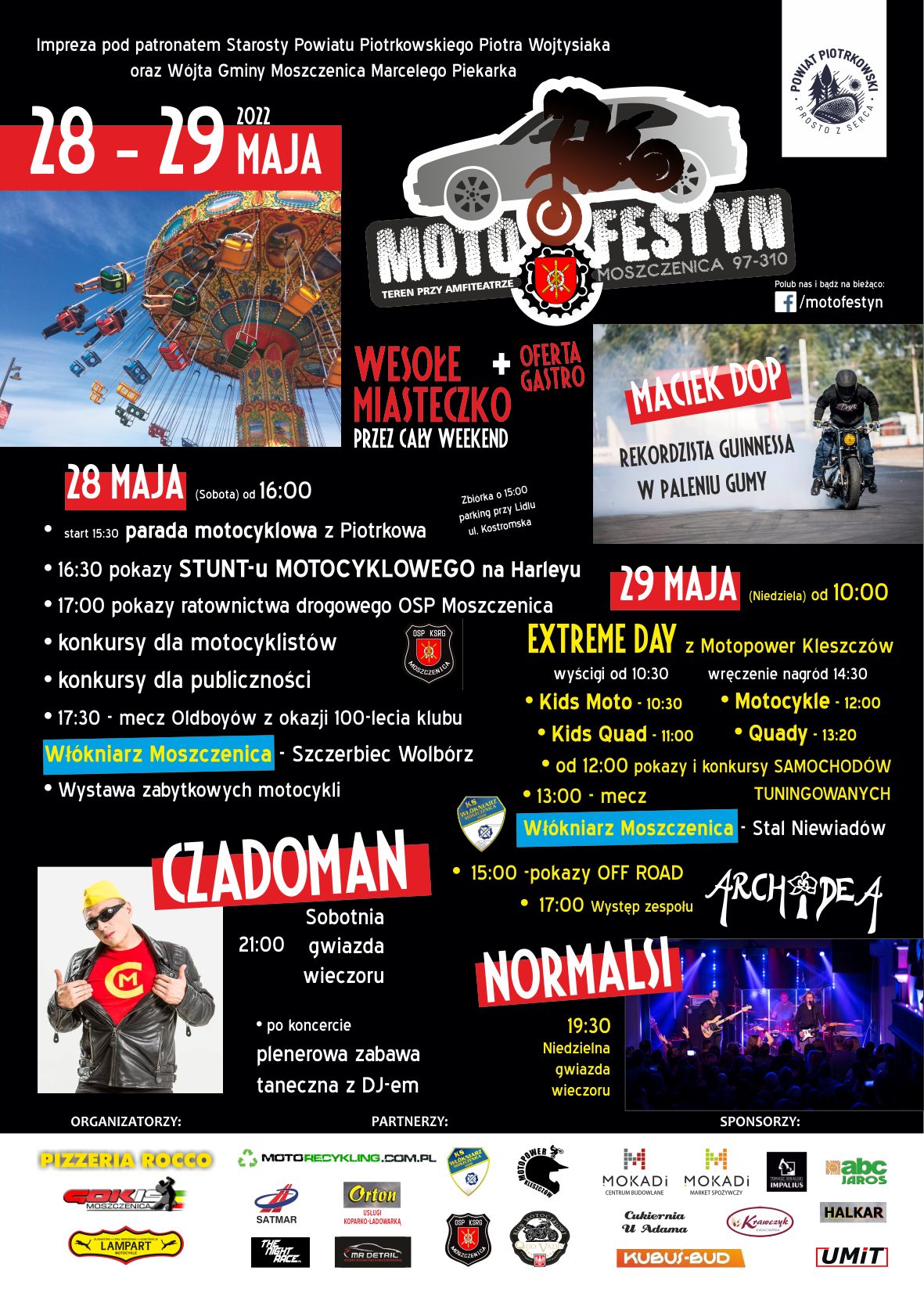 Gminny Ośrodek Kultury i Sportu w Moszczenicy zaprasza na jubileuszowy X MOTOFESTYN, który odbędzie się 28 i 29 maja na amfiteatrze w Moszczenicy.