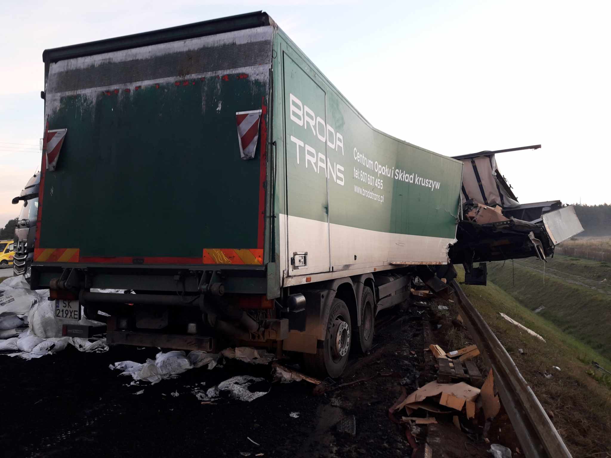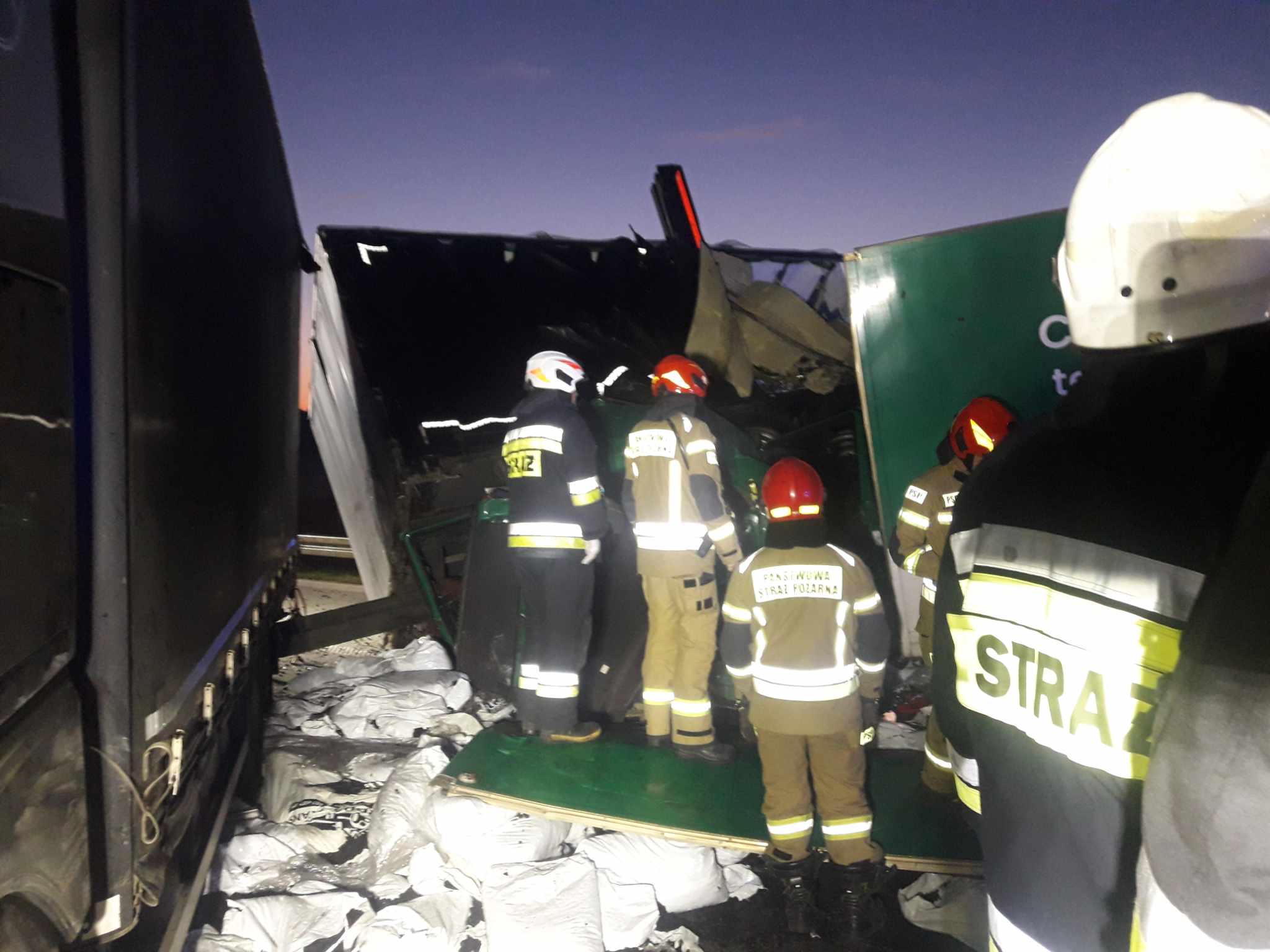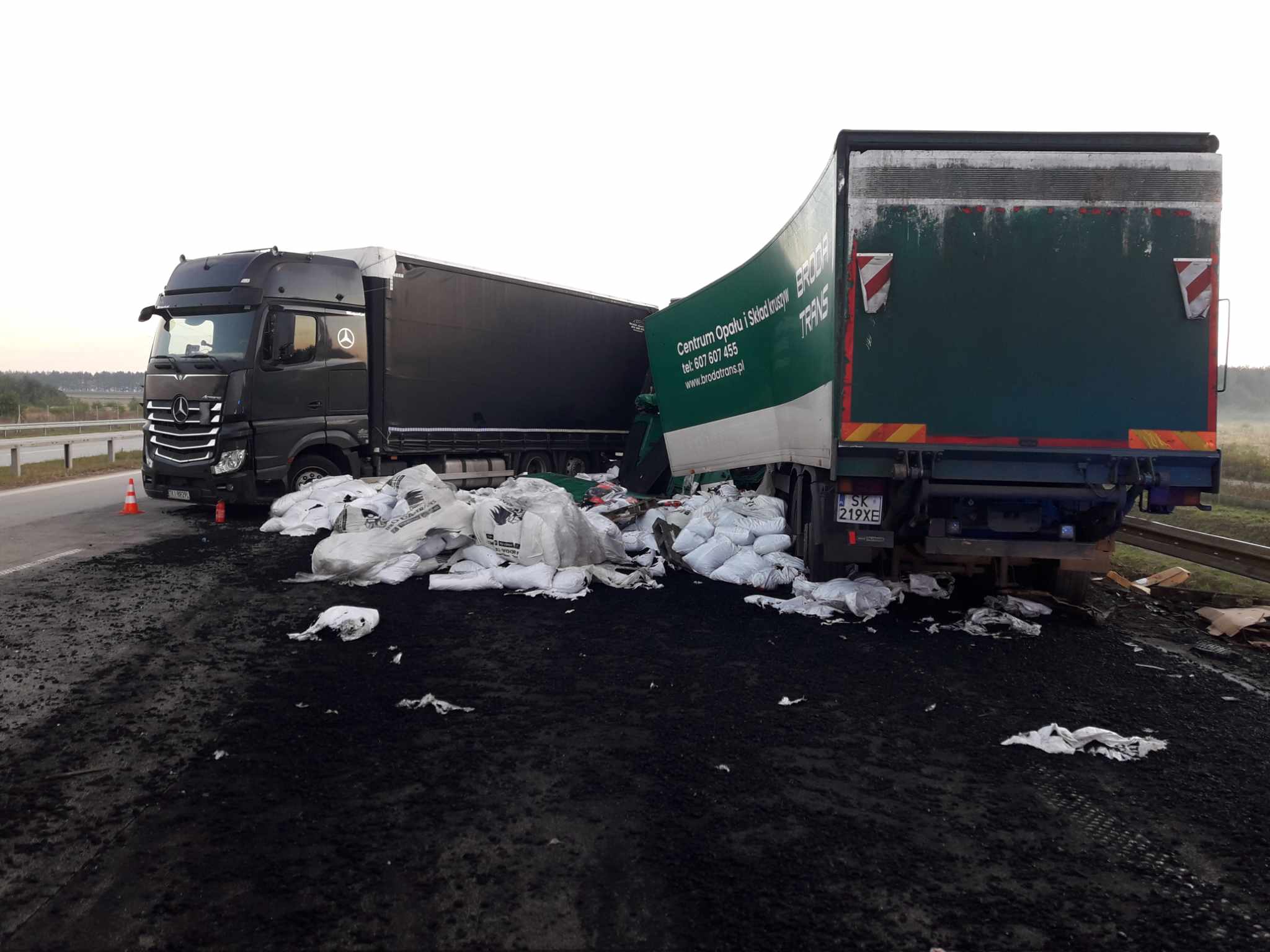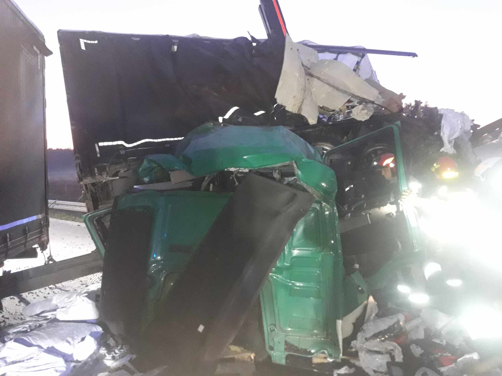 Jedna z ciężarówek przewoziła części samochodowe a druga węgiel w workach. Podczas zderzenia, węgiel rozsypał się na jezdnię. Kabina pojazdu została kompletnie zmiażdżona. Kierowca i pasażer zostali przewiezieni na badania do radomszczańskiego szpitala. Z nieoficjalnych informacji wiemy, że ich życiu nie zagraża niebezpieczeństwo.