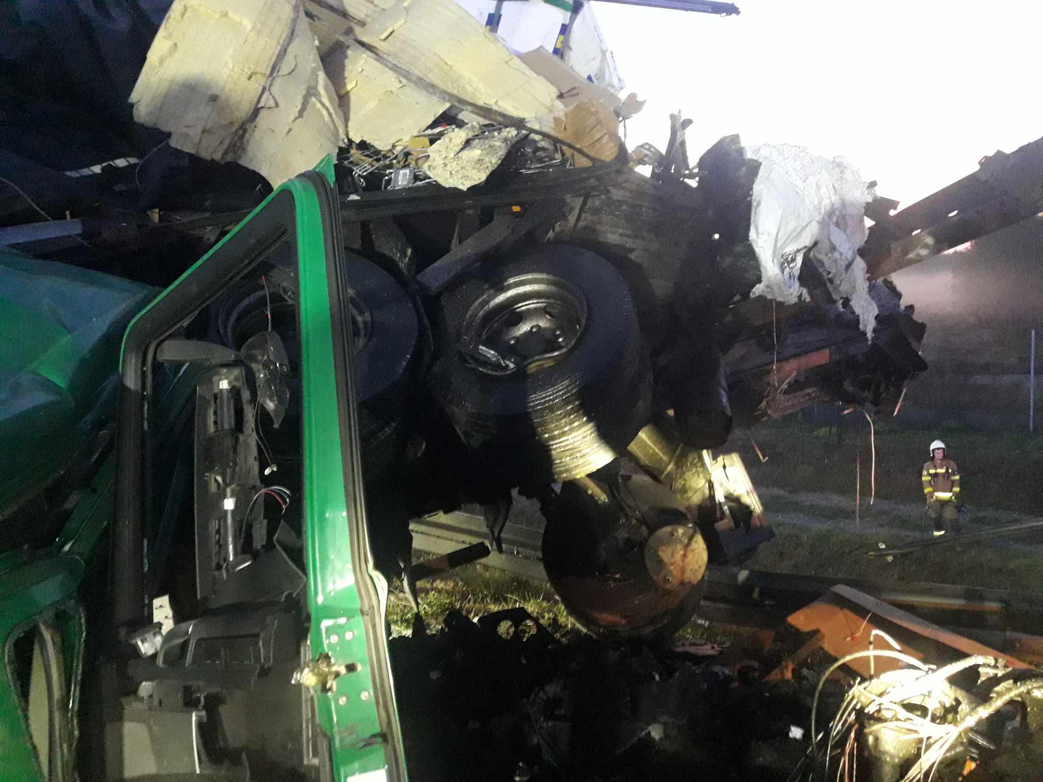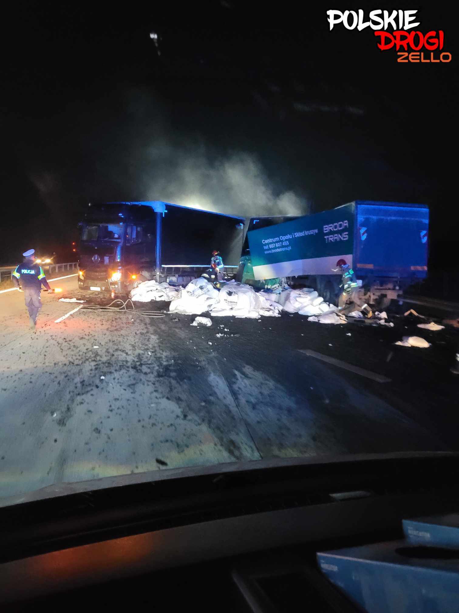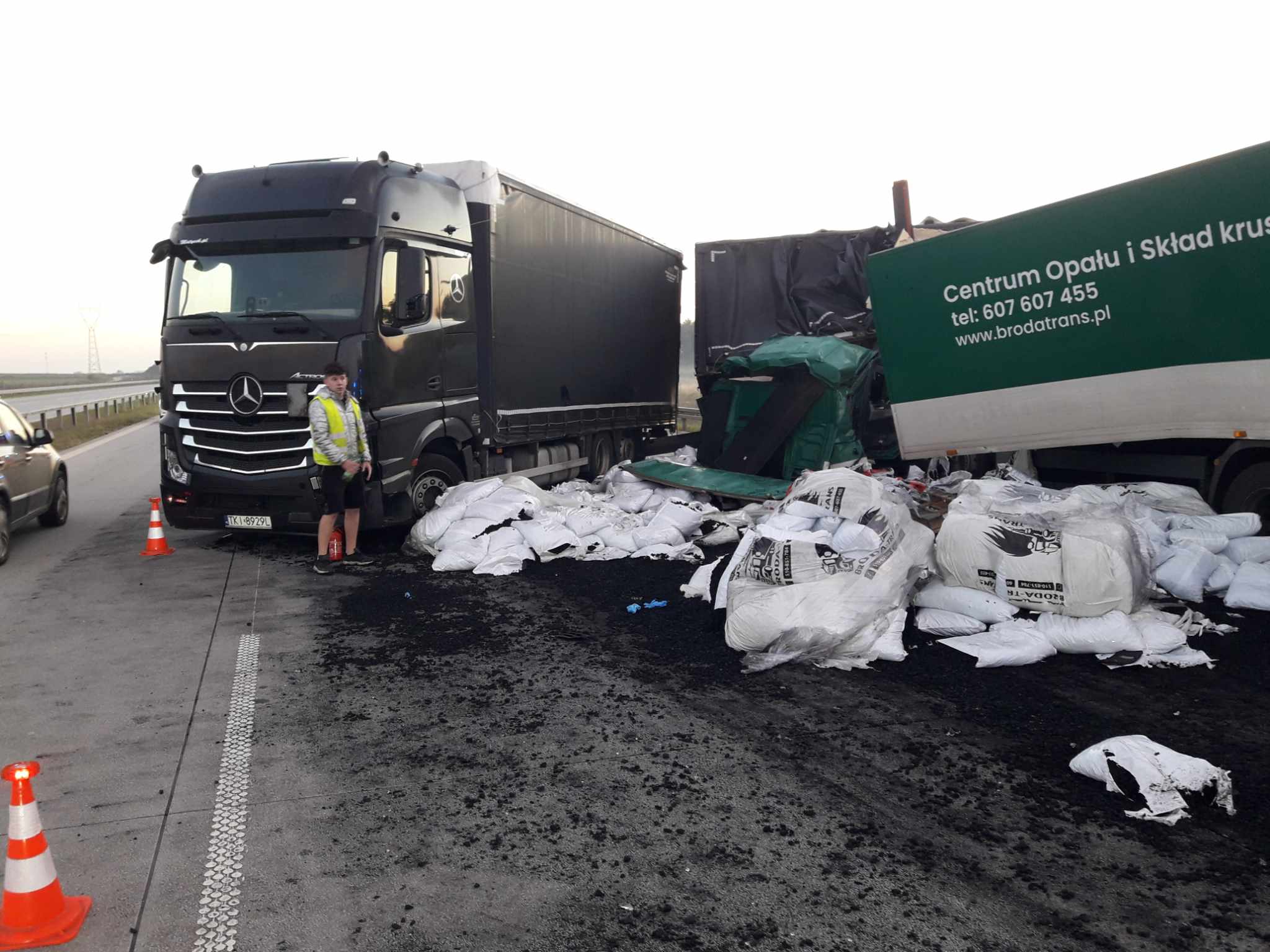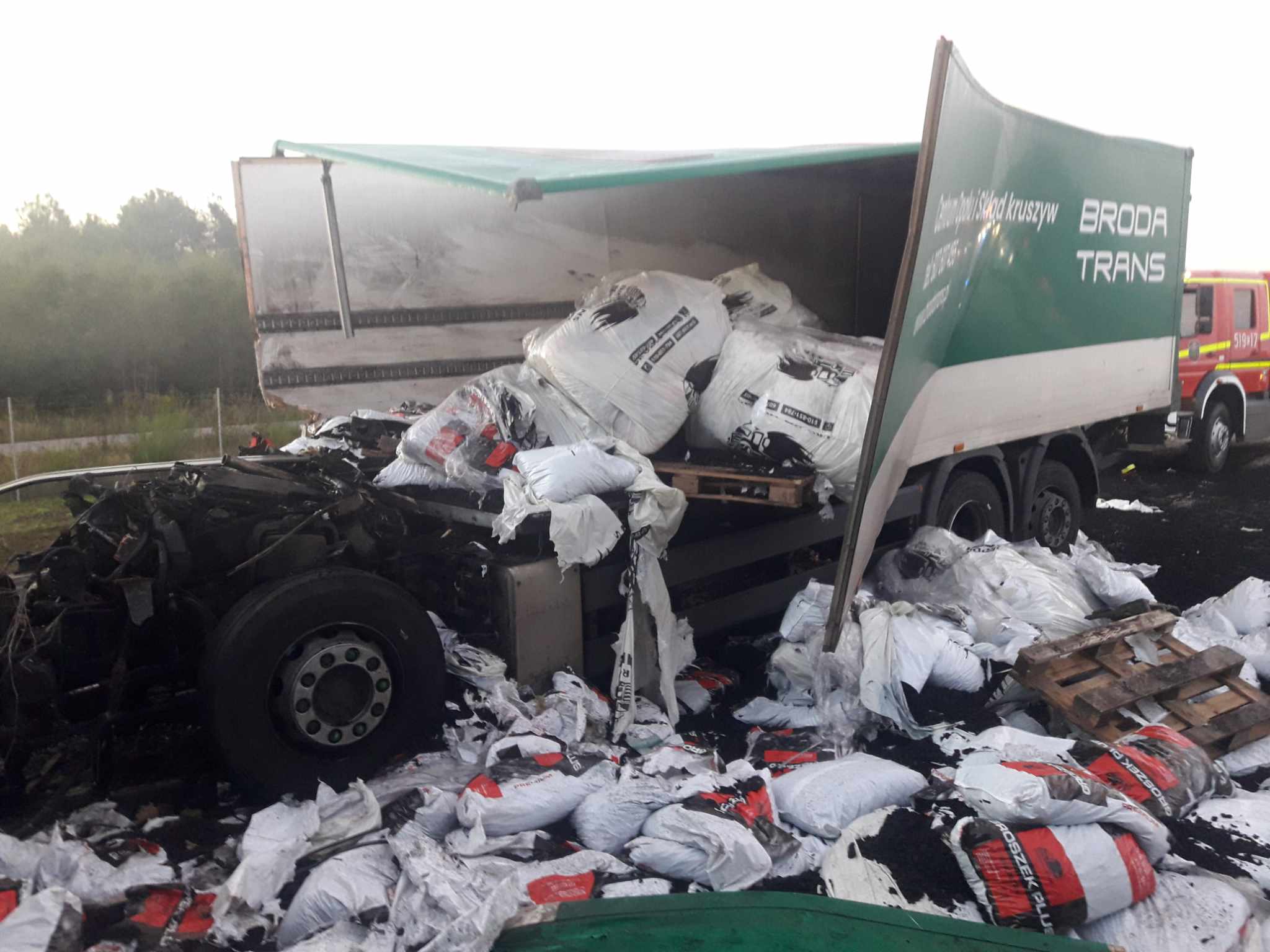Jedna z ciężarówek przewoziła części samochodowe a druga węgiel w workach. Podczas zderzenia, węgiel rozsypał się na jezdnię. Kabina pojazdu została kompletnie zmiażdżona. Kierowca i pasażer zostali przewiezieni na badania do radomszczańskiego szpitala. Z nieoficjalnych informacji wiemy, że ich życiu nie zagraża niebezpieczeństwo.