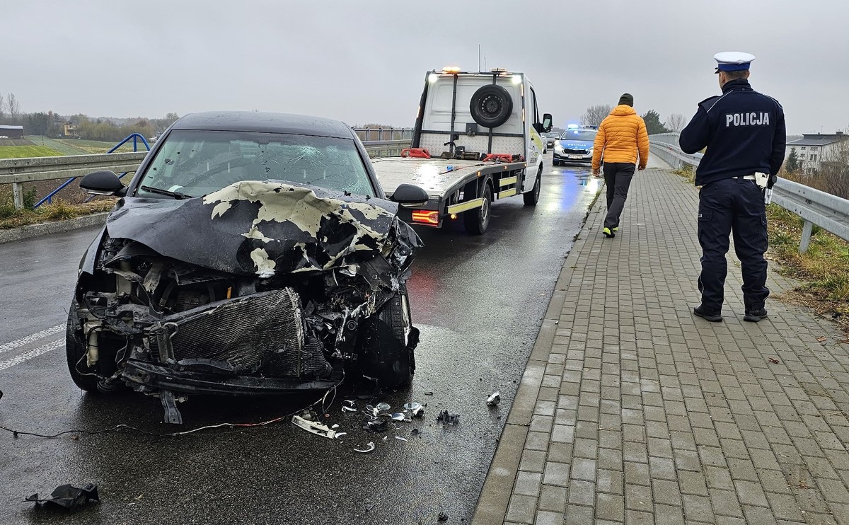 Mniej szczęścia miał kierowca volkswagena, który na wiadukcie pomiędzy miejscowością Siomki a Gąski, nie dostosował prędkości do warunków panujących na drodze, utracił panowanie nad pojazdem, a następnie zjechał na przeciwległy pas doprowadzając do zderzenia z kierującym renault. W wyniku poniesionych obrażeń kierowca volkswagena został przewieziony do szpitala. Kierowcy obu pojazdów byli trzeźwi.