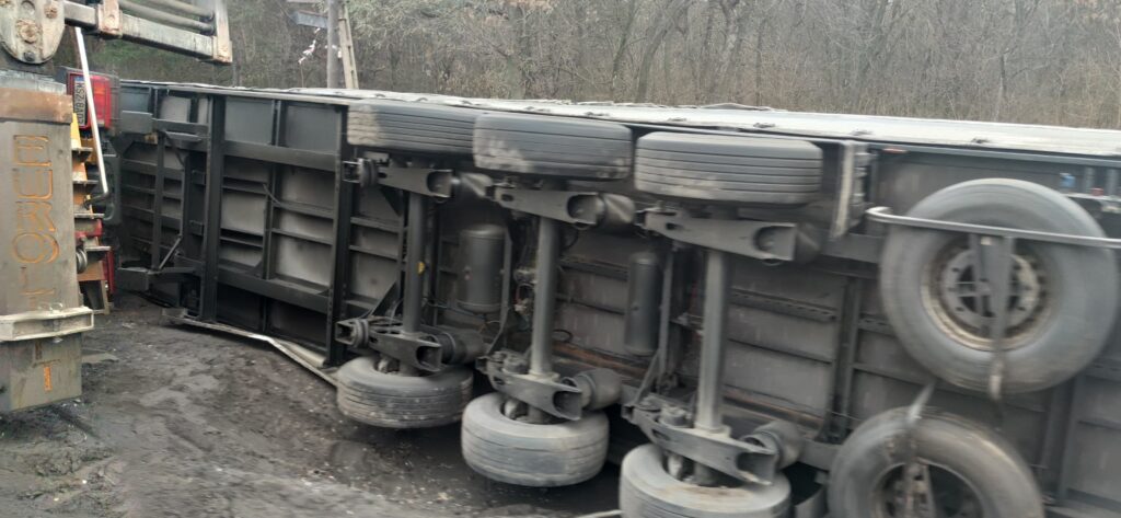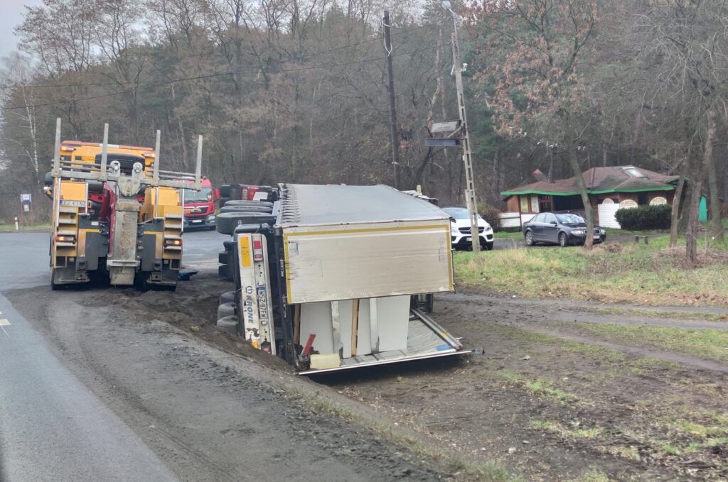 Przewrócony TIR wypełniony jest płytami kartonowo-gipsowymi, dlatego zanim naczepa i szoferka będą podniesione, ładunek musi być wypakowany. Póki co, nie jest znany dokładny przebieg zdarzenia. Nie ma także utrudnień w ruchu.