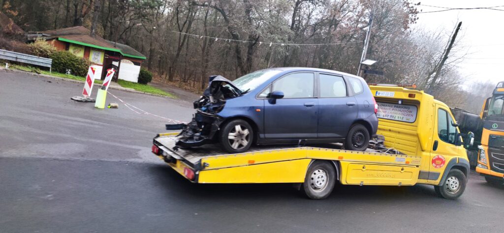 W wyniku zderzenia osobówki z ciężarówką, osobowa honda jazz nie ma przodu, a ciężarówka leży na boku.