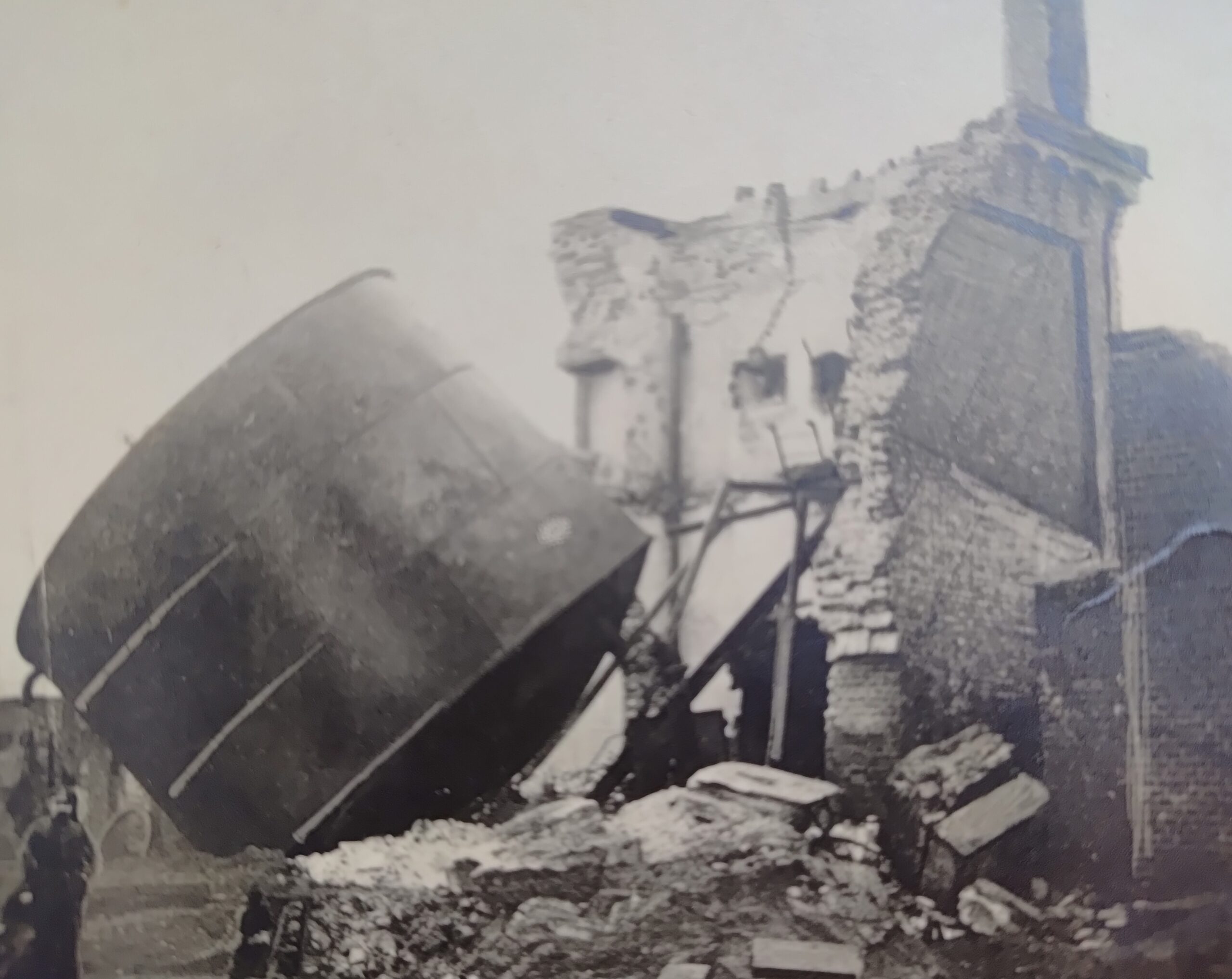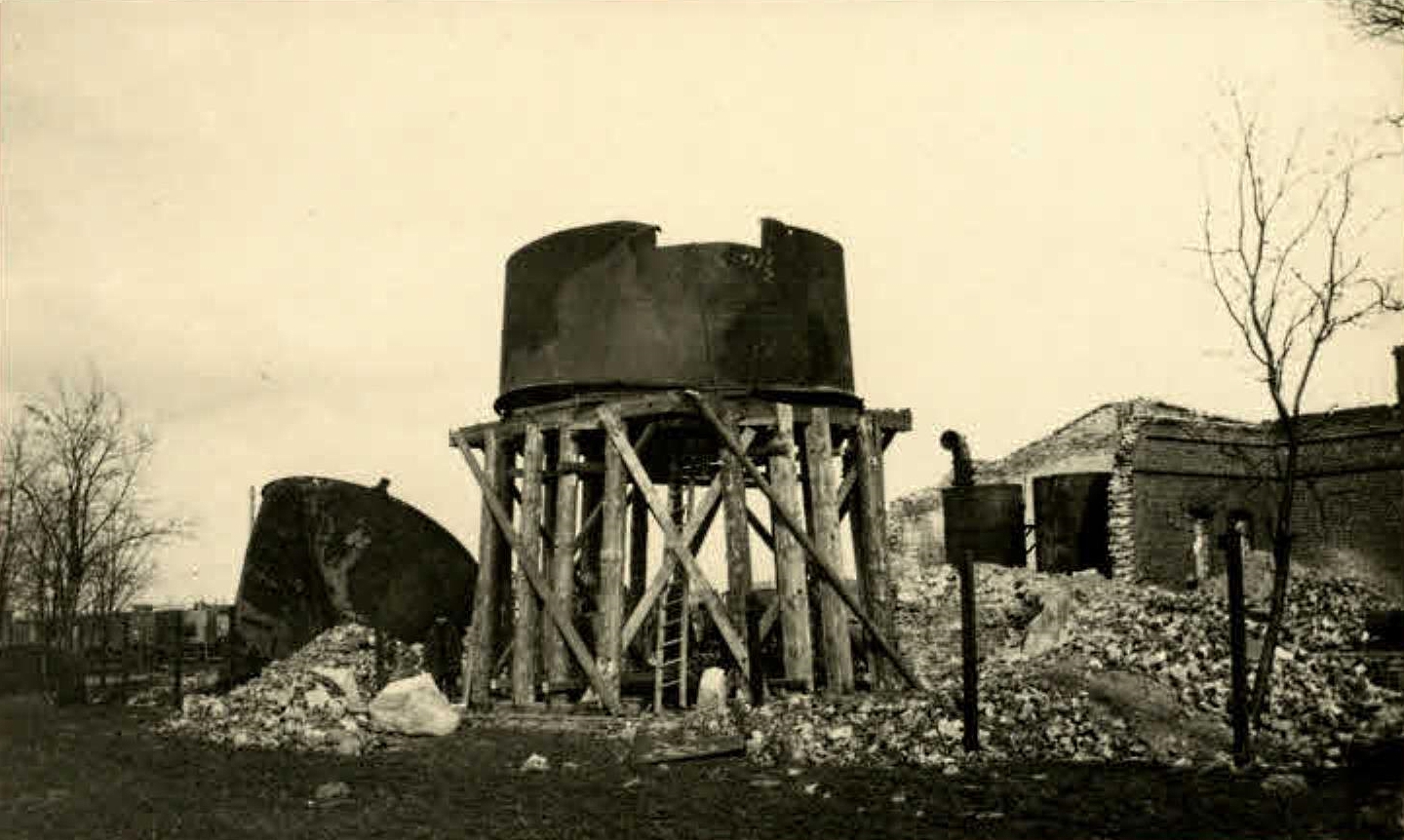 421 km, taka odległość dzieli Piotrków od Elbląga i taką odległość pokonało też zdjęcie znalezione w jednym z tamtejszych antykwariatów zanim trafiło jako ilustracja do niniejszego artykułu. Podpis w języku niemieckim („Gesprengter Wasserturm in Petrikau /Russisch-Polen/”) potwierdza, że przedstawia ono Piotrków, a właściwie jeden z obiektów na terenie miasta – wysadzoną w powietrze w październiku 1914 roku wieżę ciśnień przy kolejowym dworcu. Można przypuszczać, że owa fotografia to część serii, z której kilka innych ujęć zniszczonej wieży można odnaleźć w zbiorach portalu fotopolska.eu i że prawdopodobnie wykonała je jedna i ta sama osoba. Być może nasze zdjęcie trafiło do Elbląga, bo tam też owo osoba – prawdopodobnie żołnierz niemiecki (pruski), który dokumentował zniszczenia miasta – mieszkał. To oczywiście tylko przypuszczenia, ale właśnie owa fotografia sprzed 110 lat stała się inspiracją do podjęcia przez naszą redakcję tematu dotyczącego pierwszej piotrkowskiej wieży ciśnień.