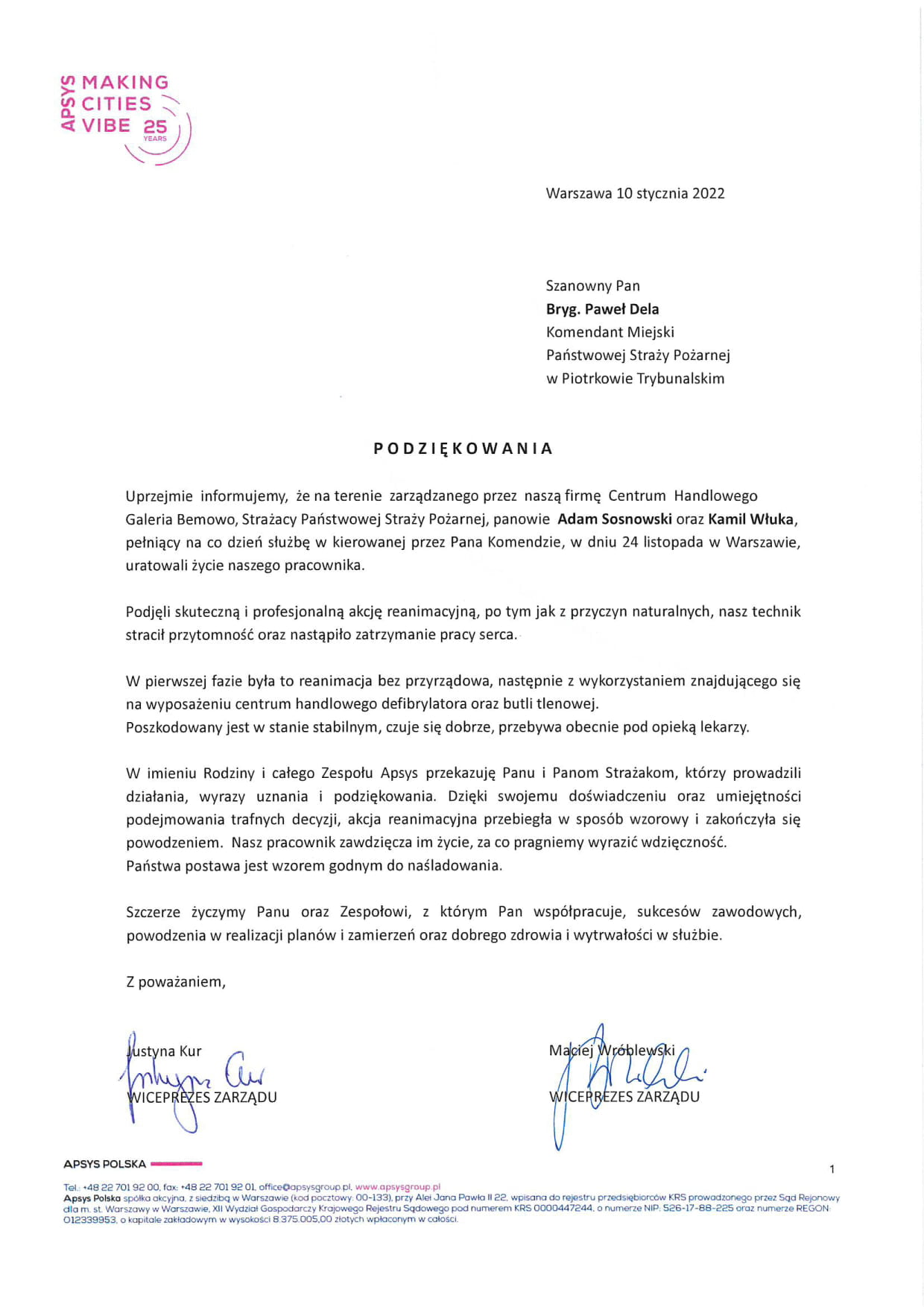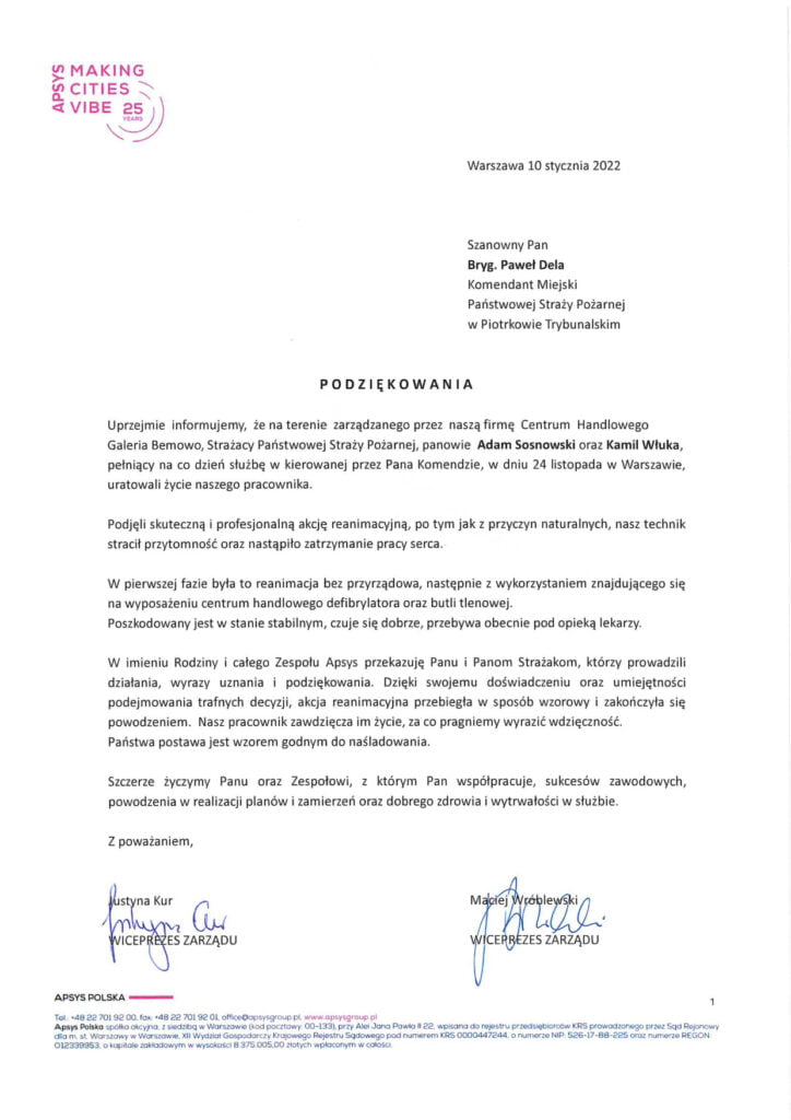 Uprzejmie informujemy, że na terenie zarządzanego przez naszą firmę Centrum Handlowego Galeria Bemowo, Strażacy Państwowej Straży Pożarnej, panowie Adam Sosnowski oraz Kamil Włuka, pełniący na co dzień służbę w kierowanej przez Pana Komendzie, w dniu 24 listopada w Warszawie, uratowali życie naszego pracownika. Podjęli skuteczną i profesjonalną akcję reanimacyjną, po tym jak z przyczyn naturalnych, nasz technik stracił przytomność oraz nastąpiło zatrzymanie pracy serca.
