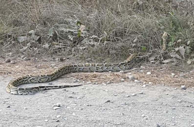 Węża prawdopodobnie ktoś wyrzucił z samochodu. Gad próbował albo wygrzewać się na asfalcie, albo przedostać na drugą stronę drogi i wtedy został przejechany. To nie jest dobra pora dla takich zwierząt. Podczas tak zimnych nocy, mógłby przeżyć jedynie dobę albo dwie poza terrarium. Dorosłe samce pytona tygrysiego osiągają długość 3-4 metrów, samice nawet ponad 5.