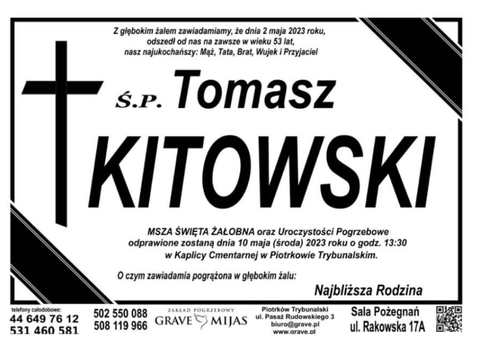 Uroczystość pogrzebowa Tomasza Kitowskiego odbędzie się 10 maja (środa) 2023 roku o godz. 13:30
