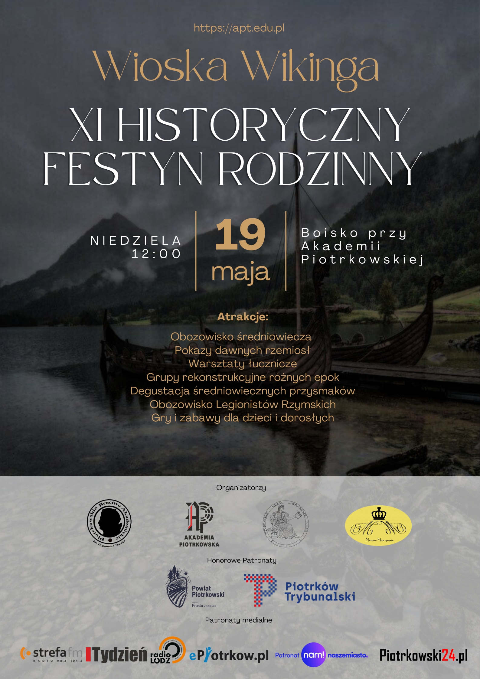 19 maja 2024 roku Akademia Piotrkowska oraz Piotrkowskie Bractwo Akademickie im. Zygmunta I Starego organizuje XI edycję Rodzinnego Pikniku Historycznego „Wioska Wikinga”.