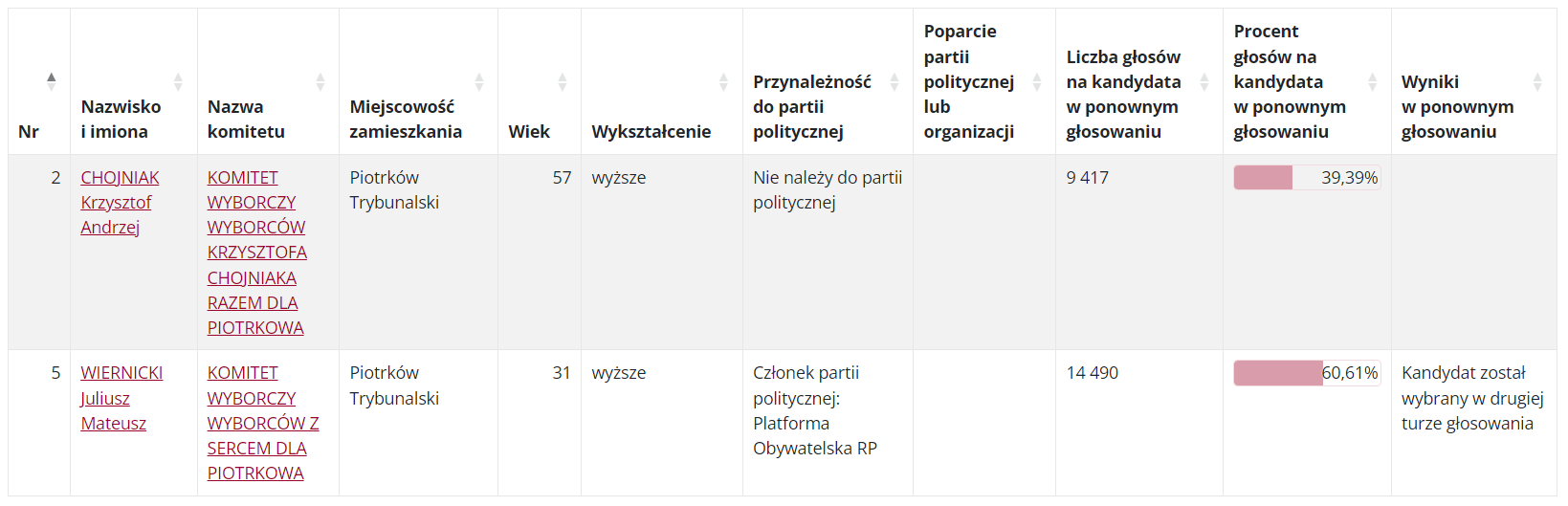 Juliusz Wiernicki startował do wyborów z komitetu „Z sercem dla Piotrkowa”. W pierwszej turze zdobył 6 106 głosów czyli 22,45% wszystkich głosów. Podczas dzisiejszego (21.04) głosowania, na Juliusza Wiernickiego głos oddało 14 490 dorosłych mieszkańców miasta. Krzysztof Chojniak zdobył 9 417 głosów. Oznacza to, że na Wiernickiego głosowało 60,61% uprawnionych do głosowania, a na K.Chojniaka 39,39% wyborców.