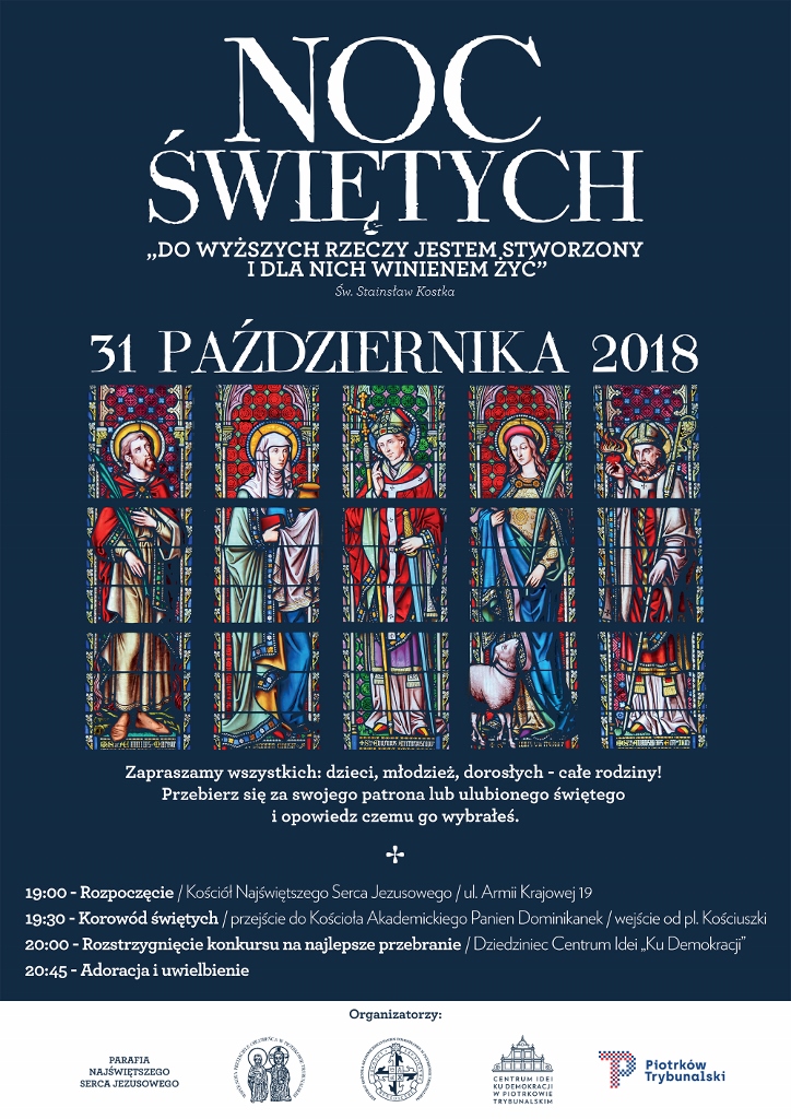 Tradycyjnie Noc Świętych rozpocznie się o godz. 19.00 w parafii Najświętszego Serca Jezusowego. Następnie korowód „świętych” przejdzie ulicą Słowackiego do Kościoła Akademickiego Panien Dominikanek, gdzie nastąpi rozstrzygnięcie konkursu na najlepsze przebranie. Uroczystość „Nocy Świętych” zakończy adoracja i uwielbienie.