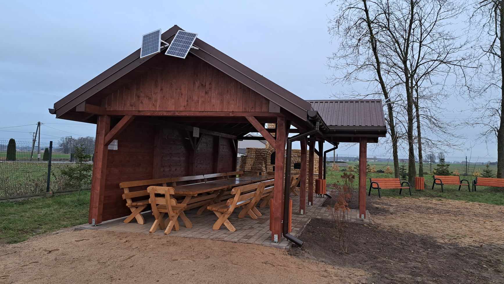 Zadanie obejmowało budowę altany ogrodowej z piecem do chleba, wędzarnią i grillem. Altanę wykonano z drewna i umieszczono na utwardzonym terenie, wyposażono w stoły, ławy do siedzenia z oparciem oraz niezbędne oświetlenie. Obok obiektu wybudowano piec do chleba z wędzarnią, grillem i blatem roboczym. Na działkę sołecką zakupiono także betonowy stół do tenisa. Całość została zwieńczona nasadzeniem drzewek i roślin ozdobnych oraz rozmieszczeniem ławeczek i koszy.