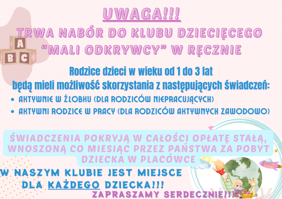 Gmina Ręczno ogłasza, że 1 czerwca 2025 roku rozpoczyna działalność nowy Klub Dziecięcy. Placówka jest gotowa przyjąć dzieci w wieku od 1 do 3 lat, zapewniając im profesjonalną opiekę i edukację w przyjaznym środowisku. Rodzice i opiekunowie mogą zgłaszać dzieci do 21.05. 2025 r.
