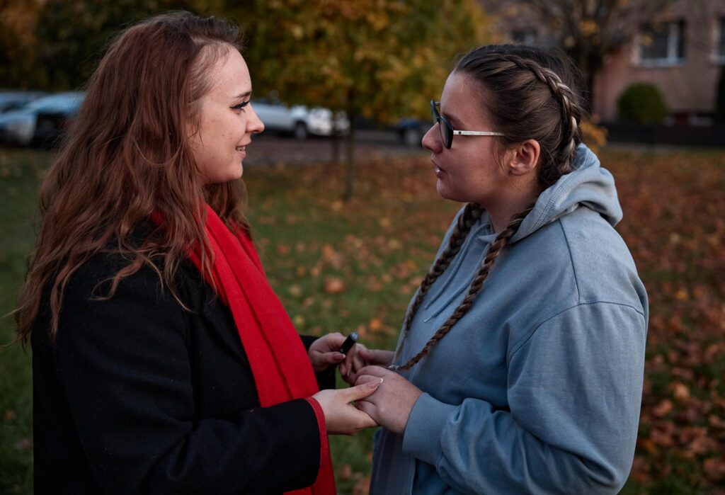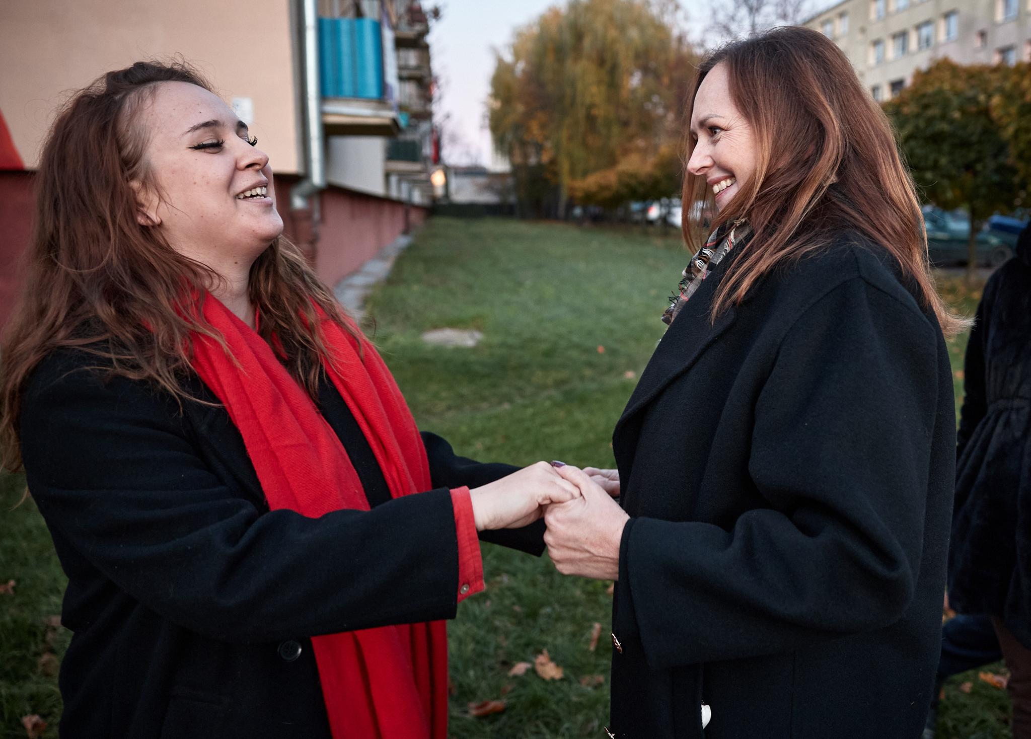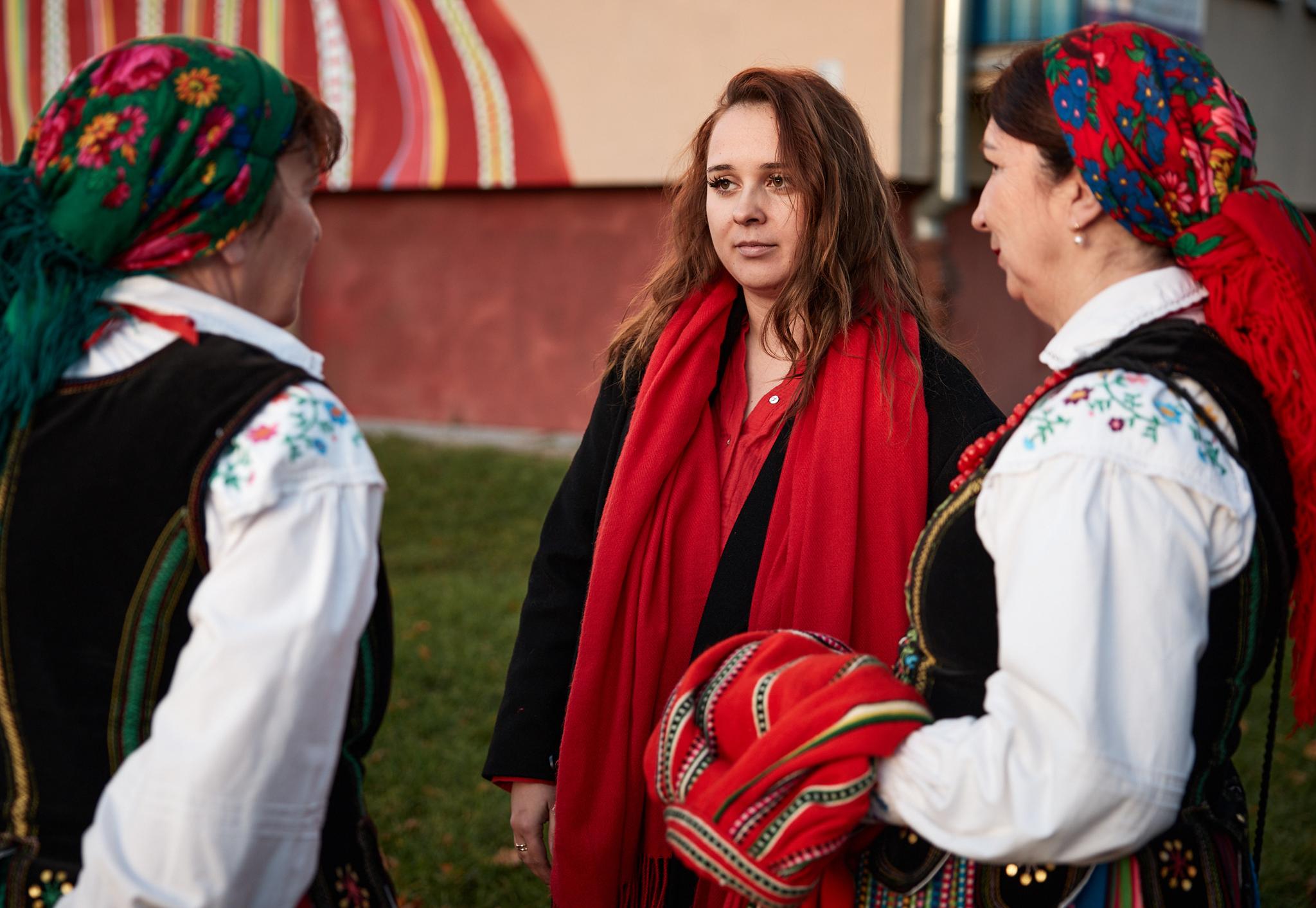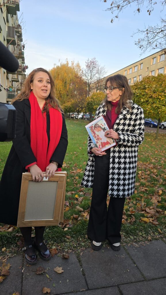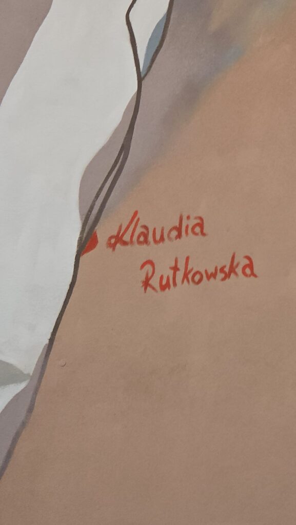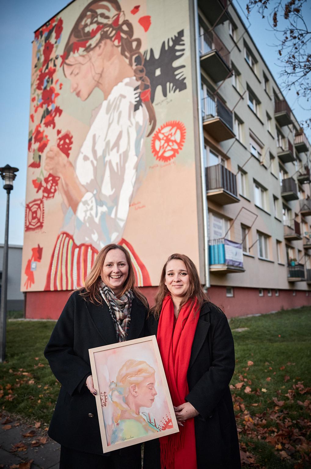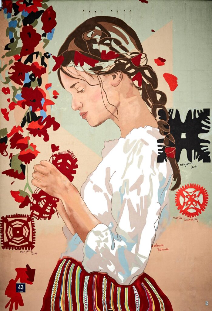 Obok niej namalowane są papierowe wycinanki z podpisanymi autorkami – regionalnymi twórczyniami ludowymi Marcjanną Durą i Marią Gronostaj. – To były kobiety, które tu działały i warto znać te nazwiska – podkreśla Klaudia. Jak dodaje, mimo, że tworzyła mural przy niesprzyjającej pogodzie, to dzięki wielkiej serdeczności i wsparciu mieszkańców ul. Łódzkiej wspomina ten czas bardzo gorąco. – Ile ja słodyczy dostałam, ile wsparcia, ile zaproszeń na kawę, na herbatę – wylicza.