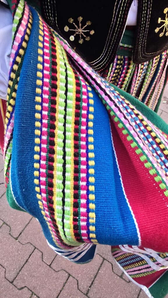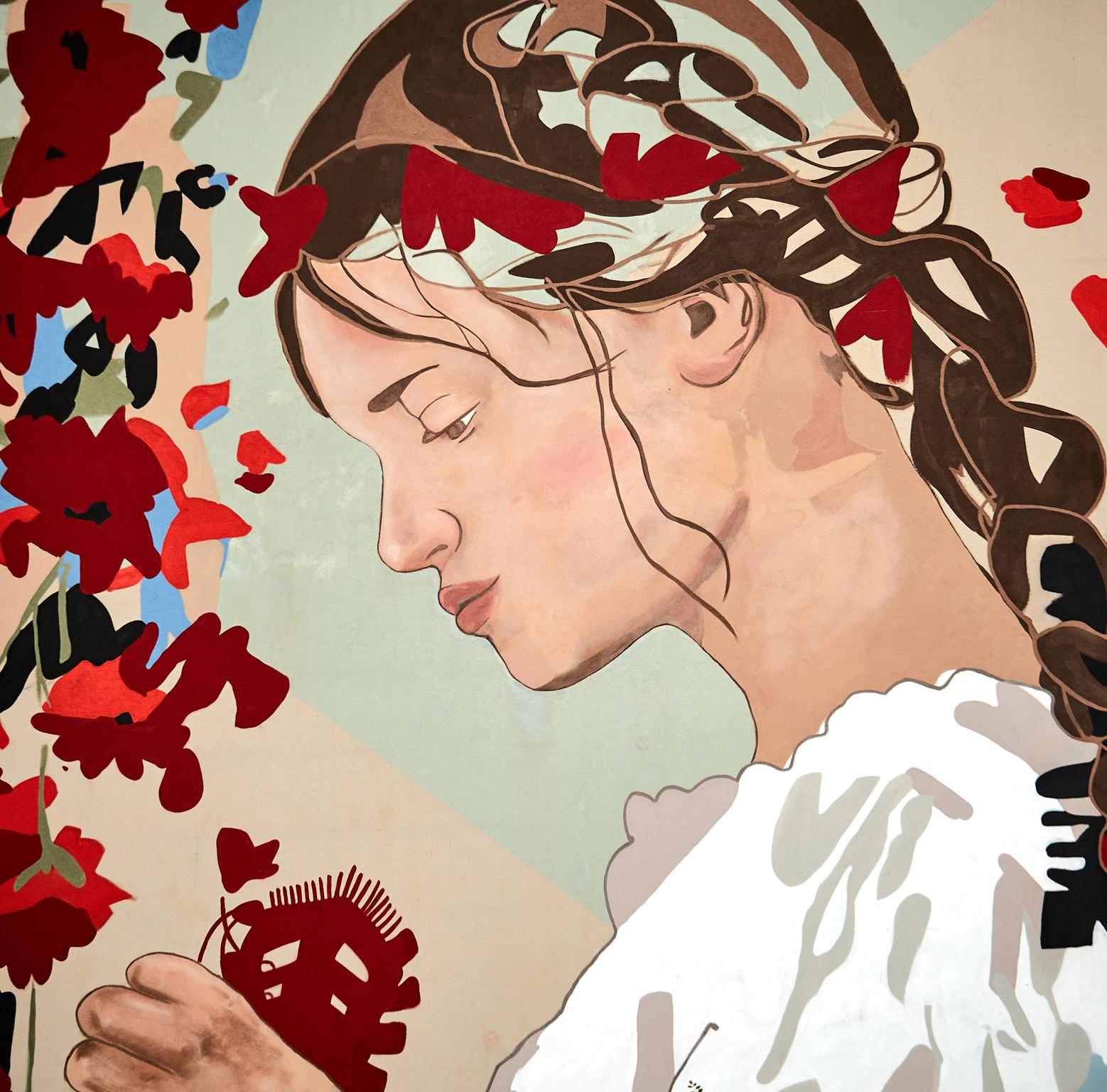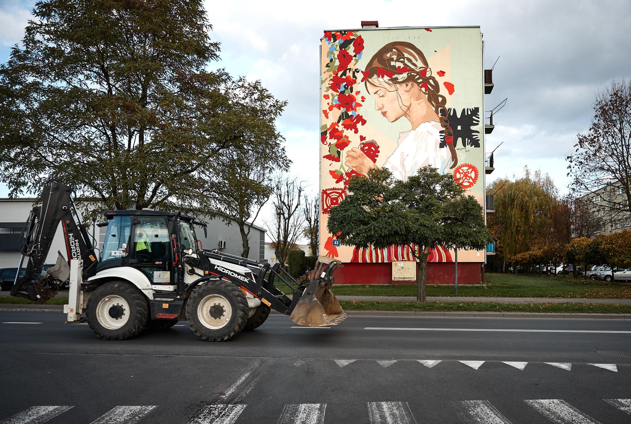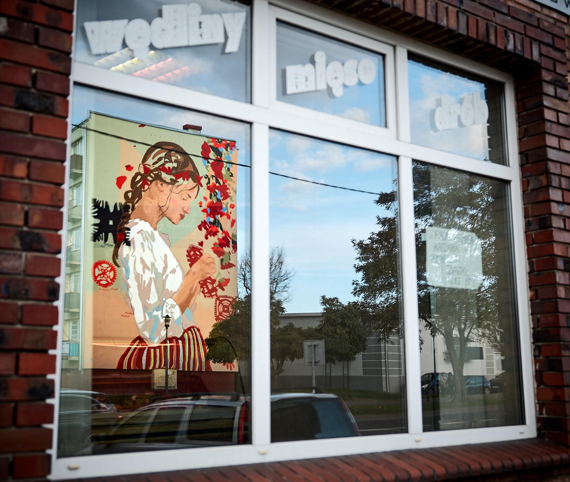 – Bardzo dużą inspiracją była moja mama, to jej obraz z młodości, zlepiony z kilku zdjęć. To jest nawiązanie do tego, żeby pamiętać skąd pochodzimy i jaką kulturę mamy „za sobą” – mówi młoda artystka. Praca powstała w wyniku konsultacji m.in. z mieszkańcami Piotrkowa podczas warsztatów, ale także z pracownikami Działu Strojów Ludowych i Tkanin oraz Działu Plastyki Ludowej Muzeum Archeologicznego i Etnograficznego w Łodzi. Bohaterka muralu ma na sobie strój z wzorami charakterystycznymi dla plecionki zdobiącej pasiaki piotrkowskiego stroju ludowego.