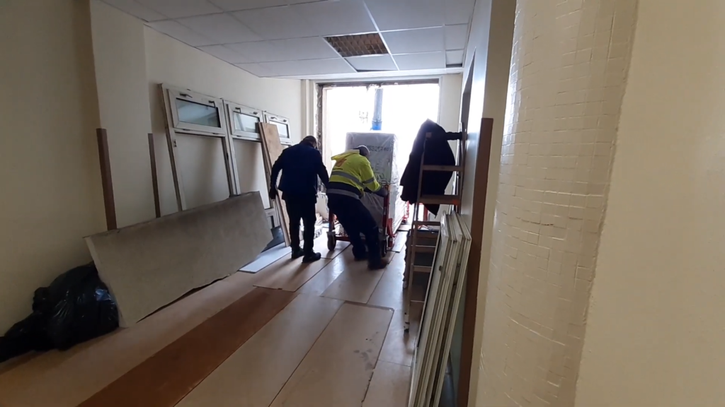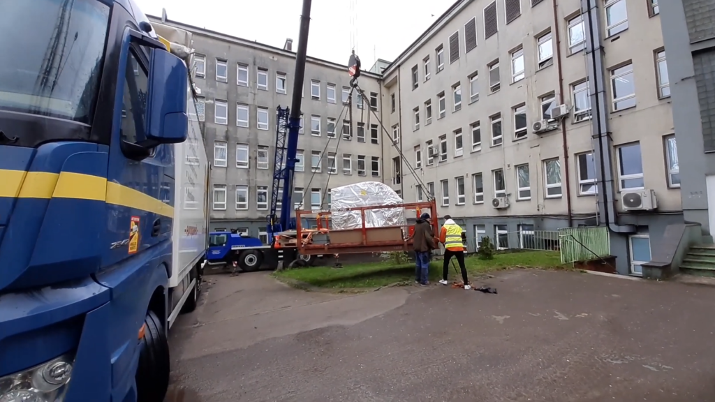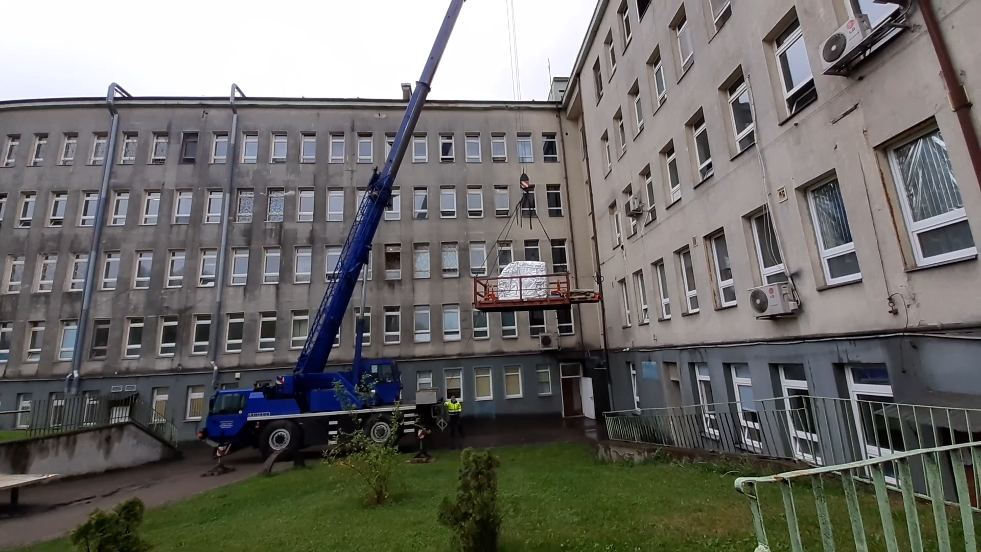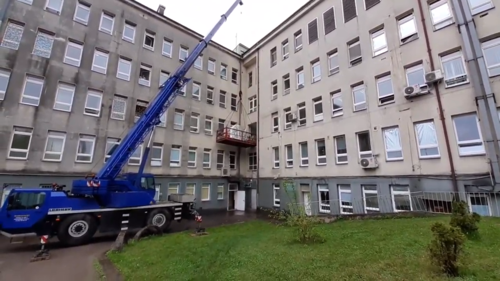 By wstawić tomograf do szpitala, trzeba było wymontować okno na 1 piętrze. Nowe urządzenie waży ponad 1,5 tony, dlatego niezbędny w pracy był dźwig.