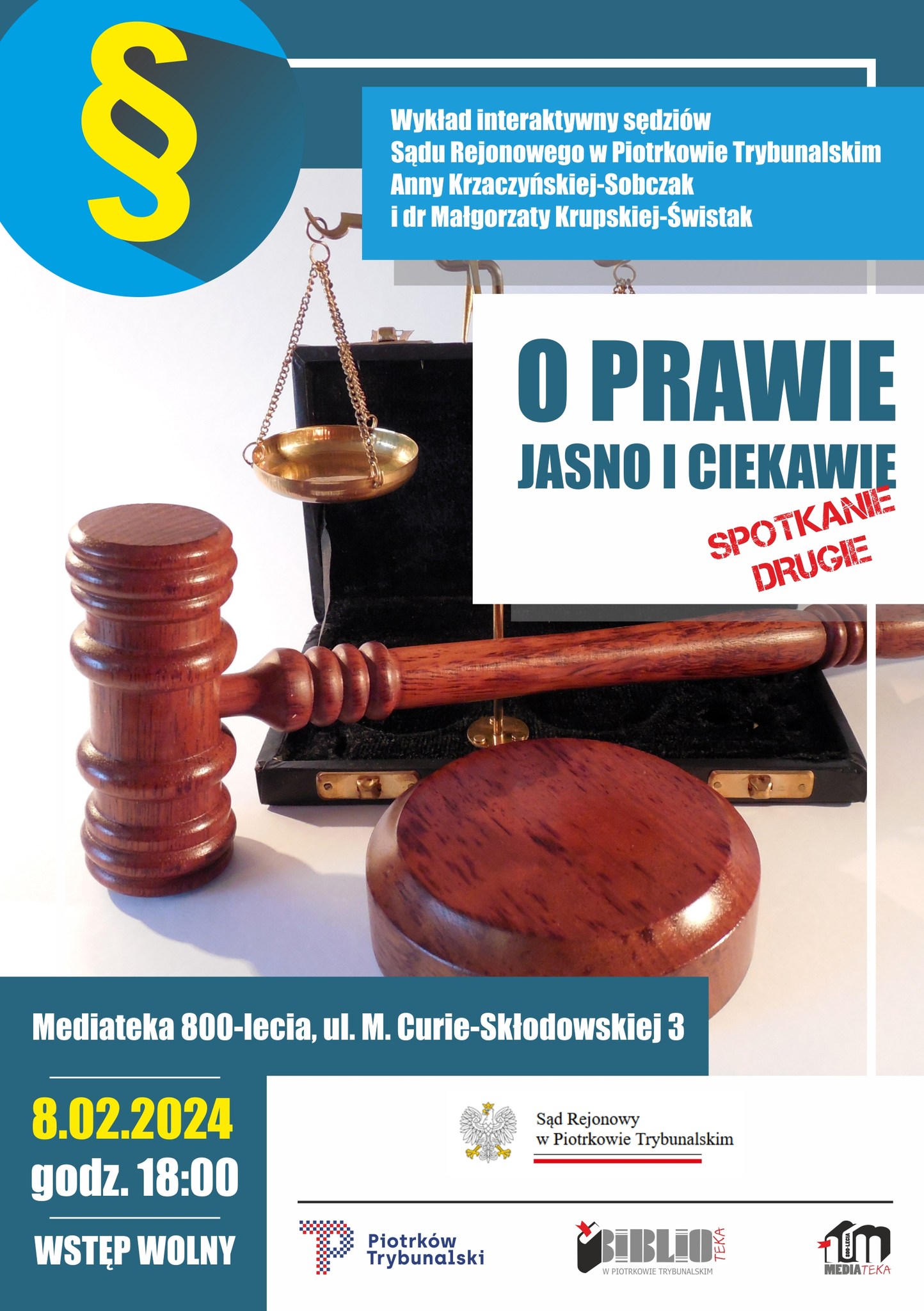 Miejska Biblioteka Publiczna zapraszamy na drugi interaktywny wykład z cyklu spotkań „O prawie – jasno i ciekawie” z przedstawicielami wymiaru sprawiedliwości. Spotkanie będzie prowadzone przez sędziów Sądu Rejonowego w Piotrkowie Trybunalskim – Annę Krzaczyńska-Sobczak oraz dr Małgorzatę Krupską-Świstak.