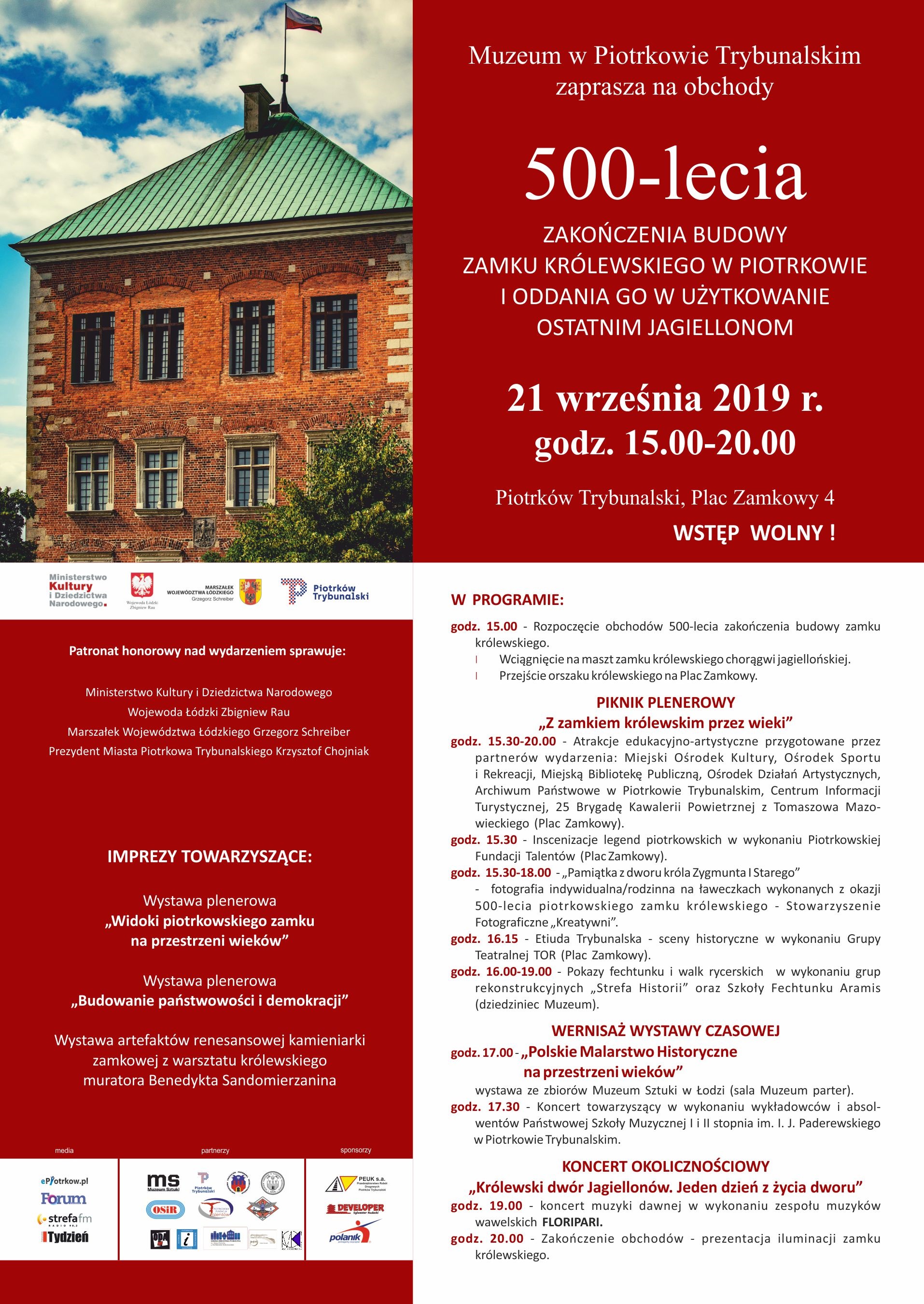 Muzeum w Piotrkowie Trybunalskim zaprasza na uroczyste obchody 500-lecia zakończenia budowy zamku królewskiego w Piotrkowie i oddania go w użytkowanie ostatnim Jagiellonom. Impreza odbędzie się 21 września 2019 r. w godzinach 15.00-20.00 na skwerze przy placu Zamkowym oraz w na dziedzińcu piotrkowskiego Muzeum.
