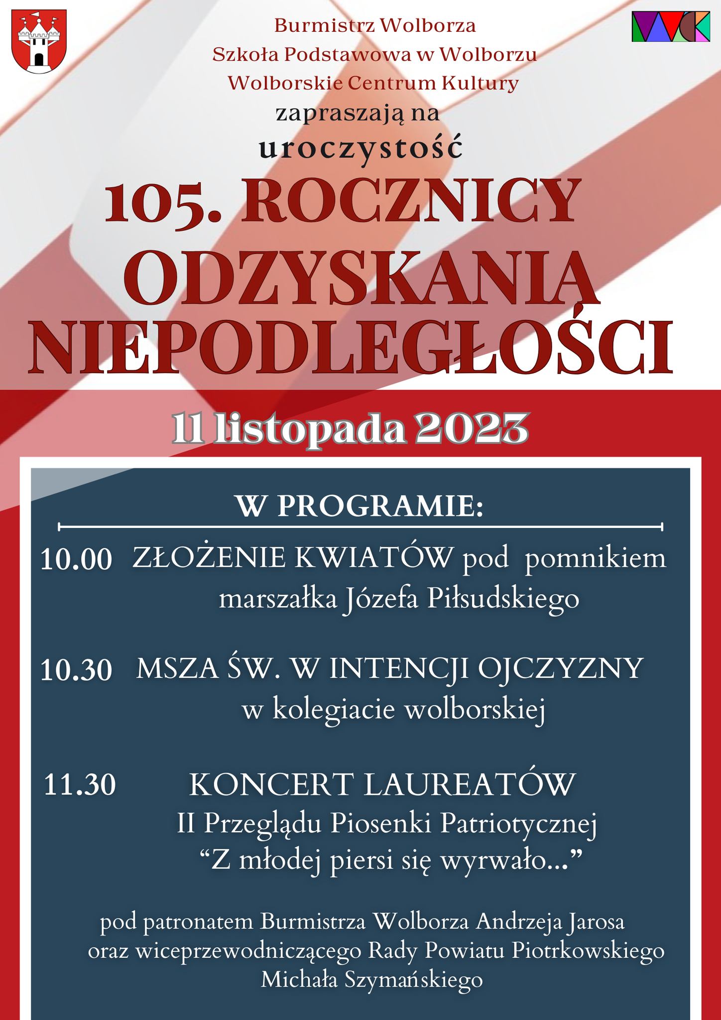 11 listopada w całym kraju odbywać się będą uroczystości związane ze 105. rocznicą odzyskania przez Polskę niepodległości. Nie inaczej będzie w gminach powiatu piotrkowskiego. N ten dzień zaplanowano pikniki historyczne, koncerty i uroczyste akademie. Szczegóły w galerii poniżej.