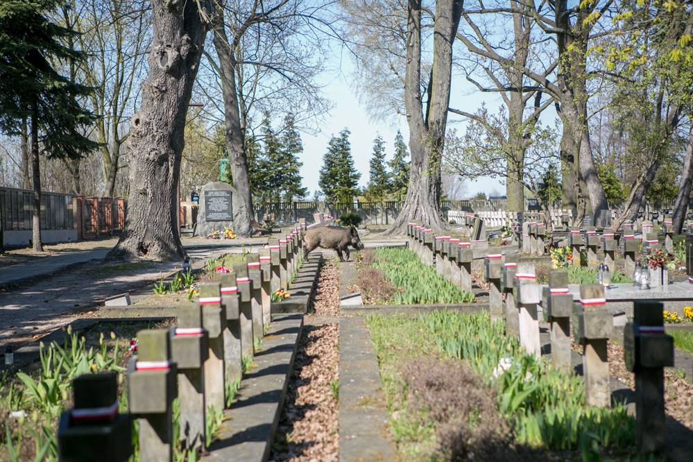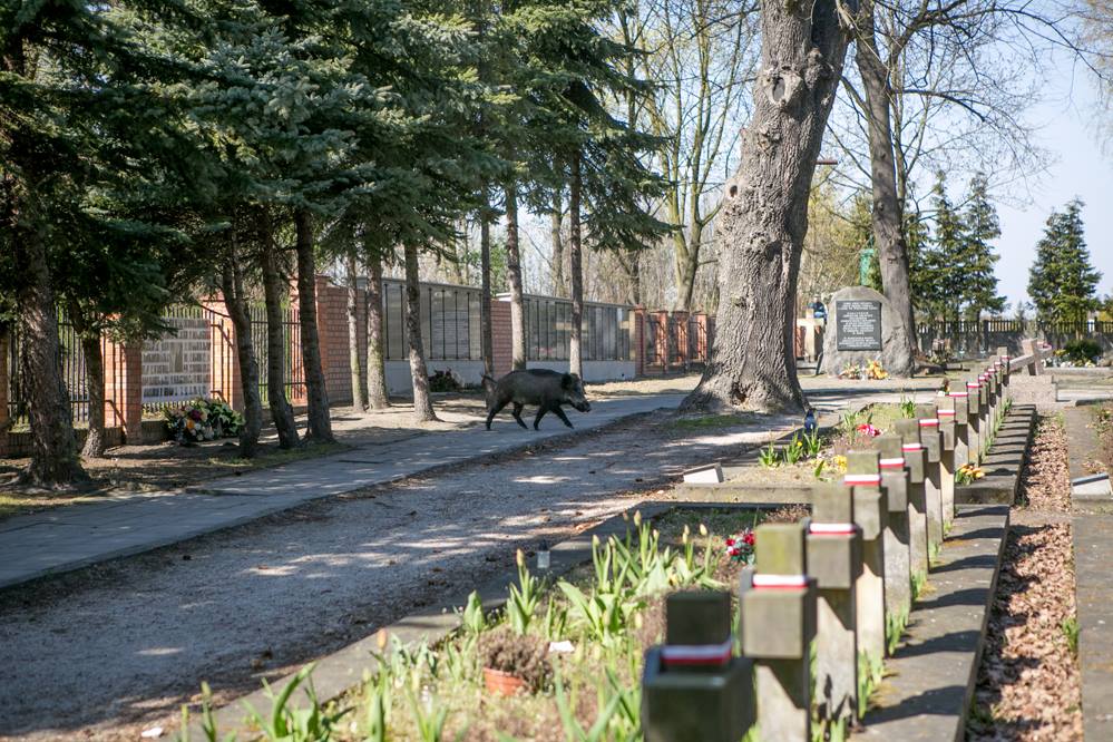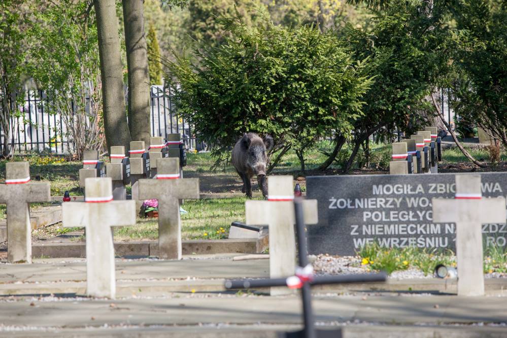 Dzik grasował na cmentarzu wojennym w Piotrkowie. Początkowo podjęto decyzje by za pomocą karabinka pneumatycznego podać zwierzęciu lek usypiający i wywieźć do lasu, skończyło się jednak na odstrzale dzika. Zgłoszenie o biegającym na cmentarzu dziku wpłynęło do piotrkowskiej straży miejskiej.
