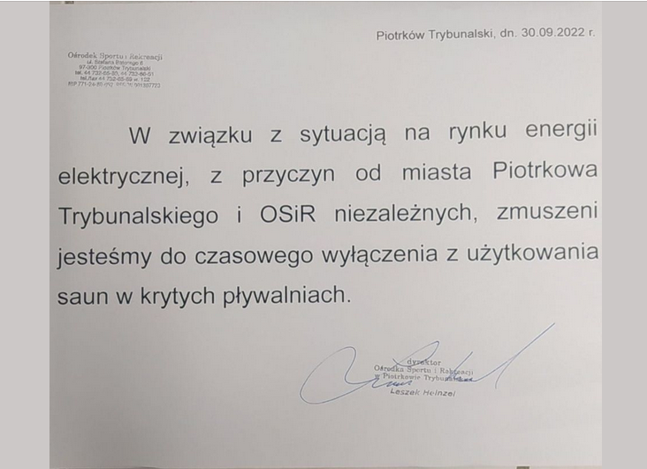 W związku z sytuacją na rynku energii elektrycznej, z przyczyn od miasta Piotrkowa Trybunalskiego i OSiR niezależnych, zmuszeni jesteśmy do czasowego wyłączenia z użytkowania saun w krytych pływalniach – czytamy w informacji podpisanej przez dyrektora ośrodka Leszka Heinzla.