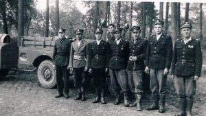 Fot. 5 Strażacy podczas ćwiczeń (od lewej: Stanisław Słowiński, Ludwik Siemiński, Stanisław Oleksiewicz, Henryk Białowąs, Zdzisław Kubus, Jan Kubus. W oddali na samochodzie Henryk Słowiński).
