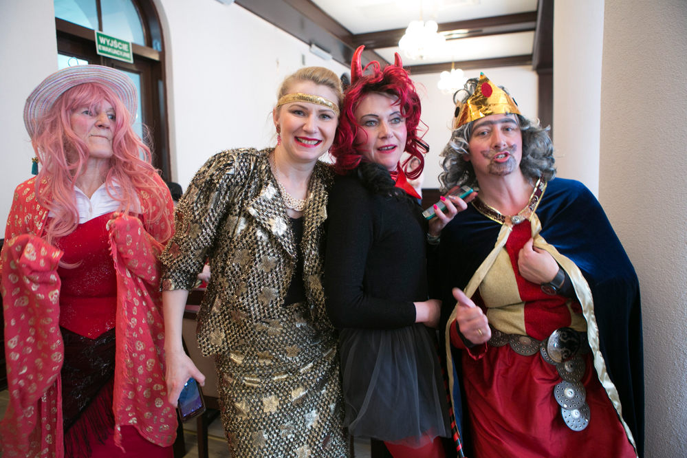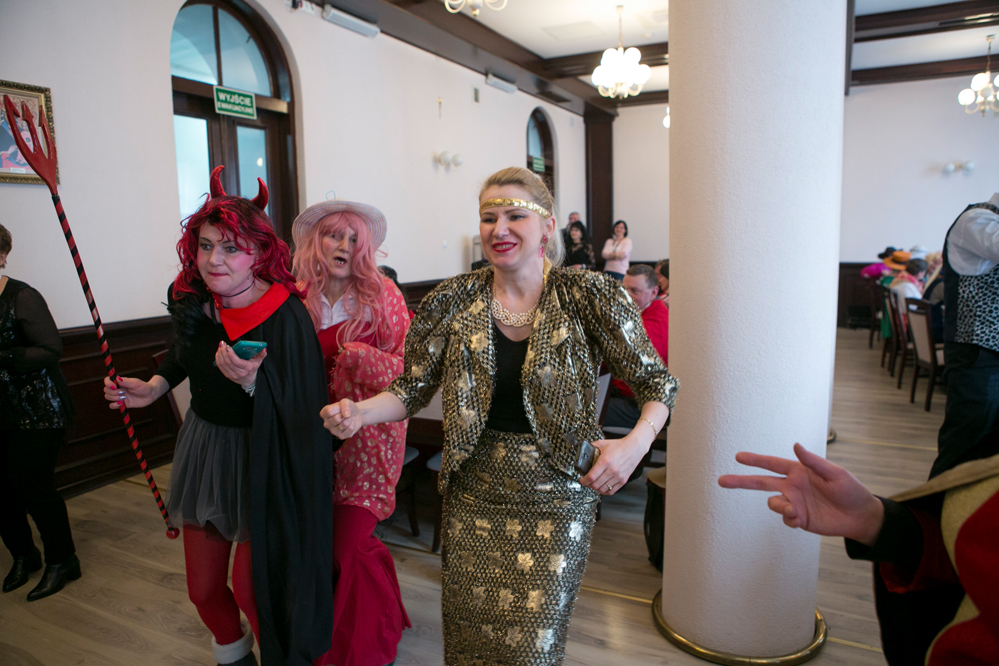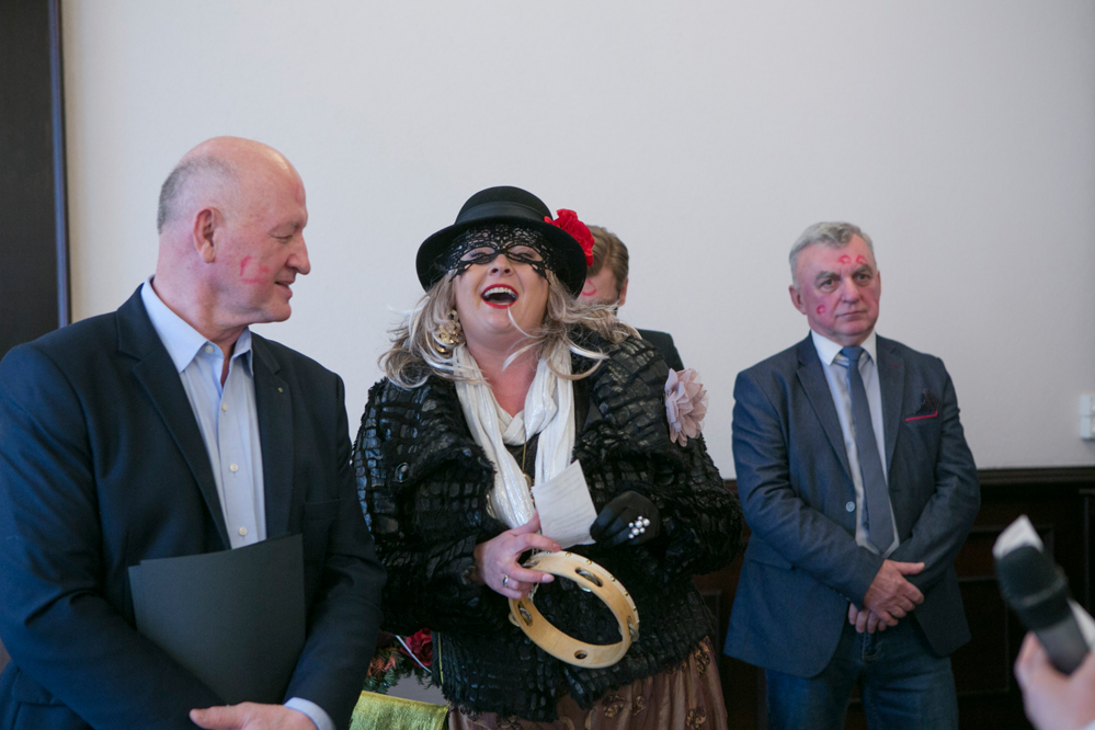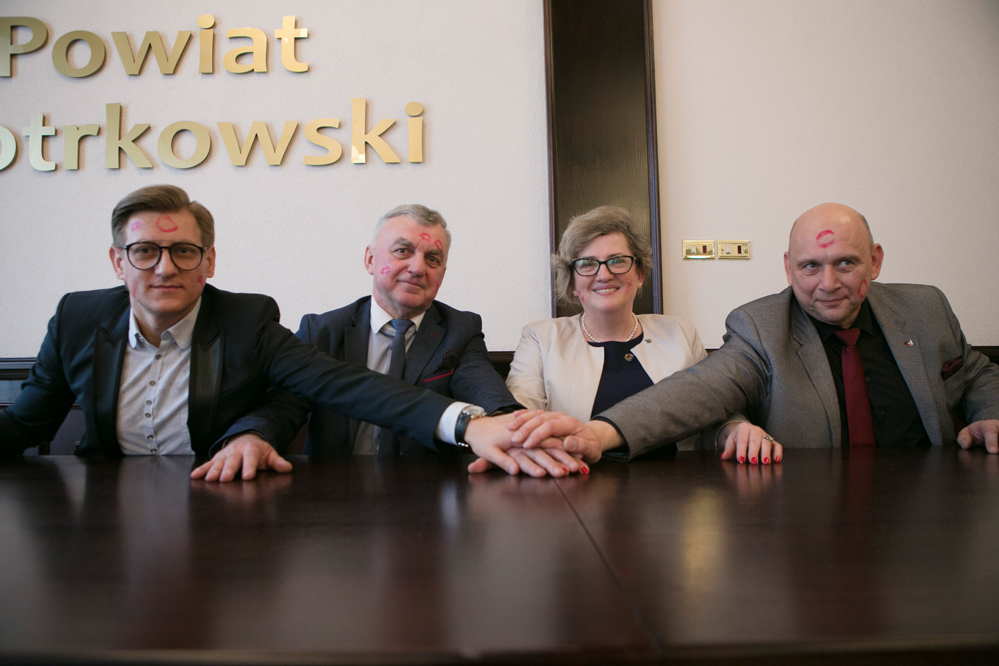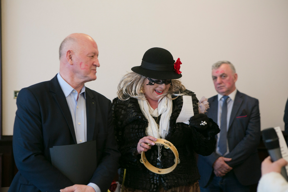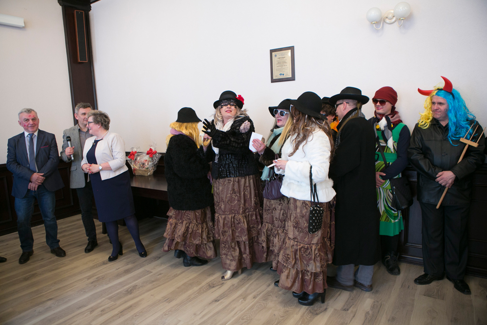 Każda z grup przygotowała specjalny program artystyczny. Zorganizowano także konkurs na najlepsze przebranie. – Każda z drużyn bardzo się starała, miała kolorowe stroje, więc każda otrzymała od nas słodki upominek – powiedział Piotr Wojtysiak, wicestarosta piotrkowski. Było też niezwykle „całuśnie”, o czym świadczyć mogą odbite usta na twarzach starostów, sekretarza powiatu, niektórych radnych i urzędników.