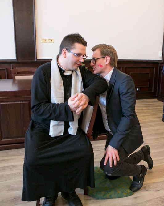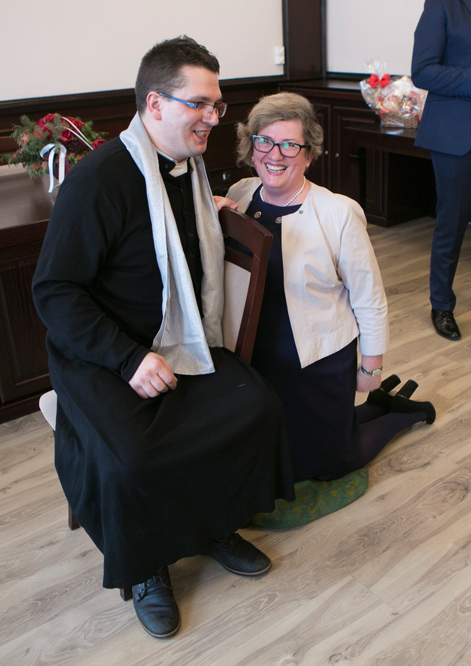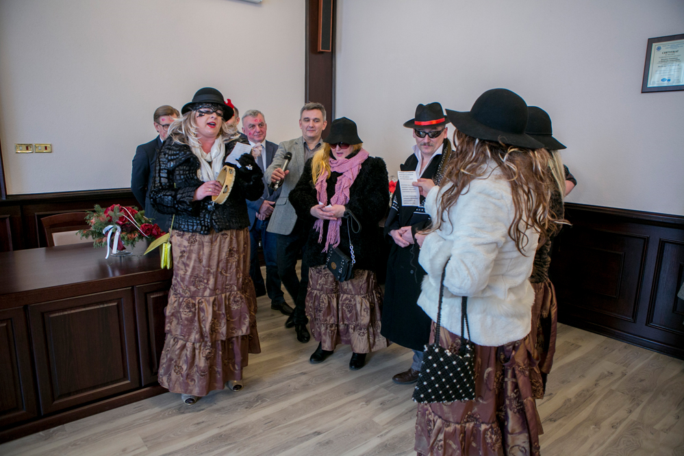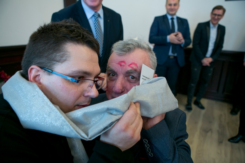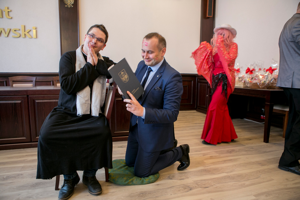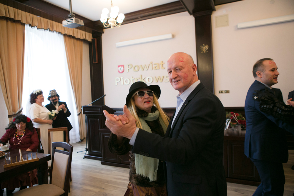 Każda z grup przygotowała specjalny program artystyczny. Zorganizowano także konkurs na najlepsze przebranie. – Każda z drużyn bardzo się starała, miała kolorowe stroje, więc każda otrzymała od nas słodki upominek – powiedział Piotr Wojtysiak, wicestarosta piotrkowski. Było też niezwykle „całuśnie”, o czym świadczyć mogą odbite usta na twarzach starostów, sekretarza powiatu, niektórych radnych i urzędników.