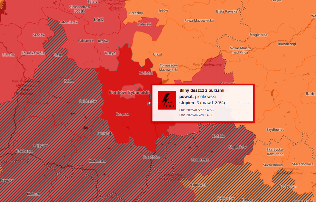 Instytut Meteorologii i Gospodarki Wodnej – IMGW PIB wydał ostrzeżenie meteorologiczne III stopnia dotyczące silnego deszczu z burzami. Ważność do godz. 14:00 dnia 28.07.2025. Prognozowane są opady deszczu o natężeniu umiarkowanym i silnym. Wysokość opadu od 90 mm do 120 mm. Opadom towarzyszyć mogą burze z porywami wiatru do 65 km/h, możliwy grad.
