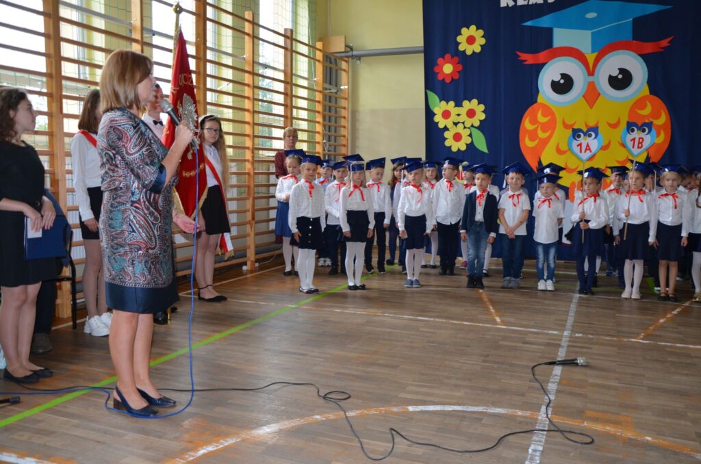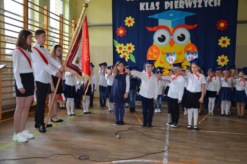 Doniosłym momentem uroczystości było ślubowanie pierwszoklasistów, które wzbudziło wiele emocji. W podniosłej atmosferze, przed pocztem sztandarowym, odświętnie ubrani i przejęci pierwszacy przyrzekli, że będą kochać Ojczyznę, dbać o dobre imię swojej klasy i szkoły, będą dobrymi kolegami oraz że swym właściwym zachowaniem i nauką będą sprawiać radość rodzicom i nauczycielom. Potem przyszedł czas na kolejny ważny moment tej uroczystości – pasowanie na uczniów. Symbolicznym ołówkiem dokonała tego dyrektor szkoły Magdalena Majos.