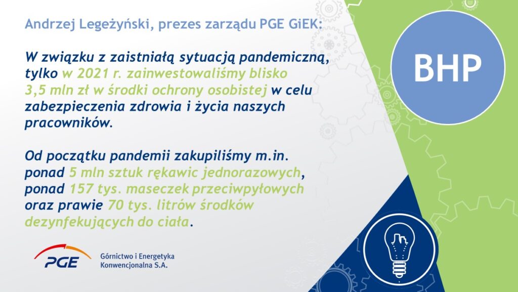 – W PGE GiEK promujemy działania związane bezpieczeństwem i higieną pracy i zawsze poszukujemy takich rozwiązań organizacyjnych, które uwzględnią konieczność ochrony zdrowia i życia pracowników oraz zapewnią im właściwe warunki pracy – podkreśla Andrzej Legeżyński, prezes zarządu PGE Górnictwo i Energetyka Konwencjonalna.