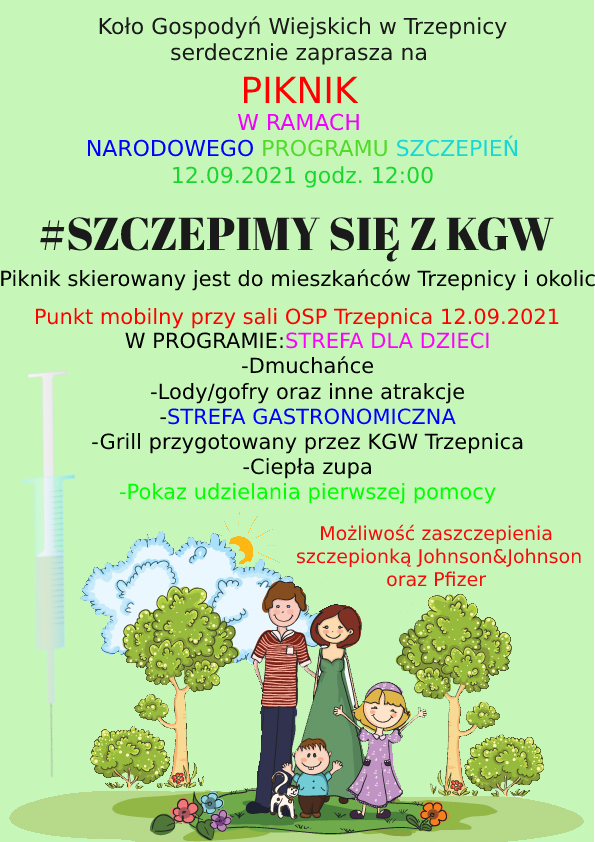 Zapraszamy na piknik rodzinny połączony z akcją szczepień. Tym razem zabawa odbędzie się w najbliższą niedzielę, 12 września w Trzepnicy w gminie Łęki Szlacheckie. Początek o godzinie 12:00. A w programie: możliwość zaszczepienia się przeciwko COVID-19, zabawy na dmuchańcach, gry i zabawy sprawnościowe, grill przygotowany przez KGW Trzepnica, lody, gofry i ciepła zupa.