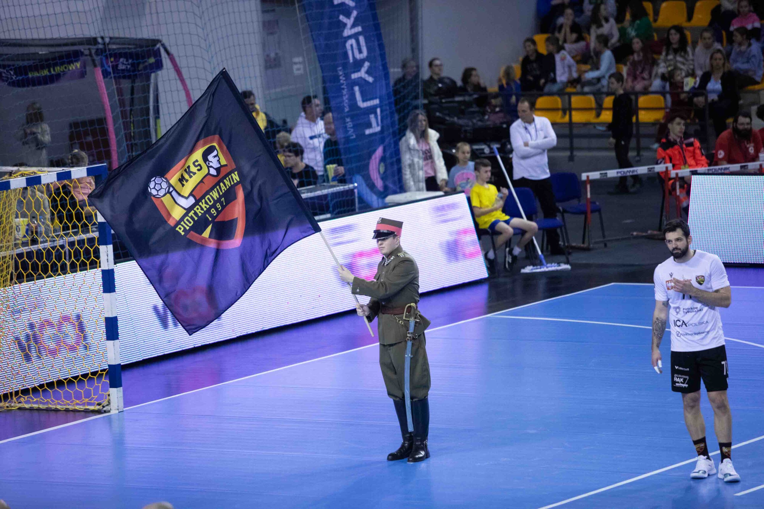 Natomiast na boisku od pierwszej minuty ton nadawali zawodnicy Industrii Kielce. Zaczęli ten mecz niemalże w przewadze, bo już w 38. sekundzie za atak na twarz wykluczony na dwie minuty został Patryk Mastalerz. To spowodowało łatwe prowadzenie 3:0 po trzech bramkach Dylana Nahiego. W kolejnych minutach trener przyjezdnych Michał Matyjasik delegował do ataku siedmiu zawodników. Pomysł niestety nie wypalił, bo zawodnicy z Piotrkowa nie bardzo potrafili znaleźć sposób na szczelna kielecką obronę. Do tego w bramce kilkoma dobrymi interwencjami popisał się Miłosz Wałach. Na potwierdzenie tych słów niech będzie sytuacja między 13. a 14. minutą, gdzie kielczanie w łatwy sposób zdobyli trzy bramki.