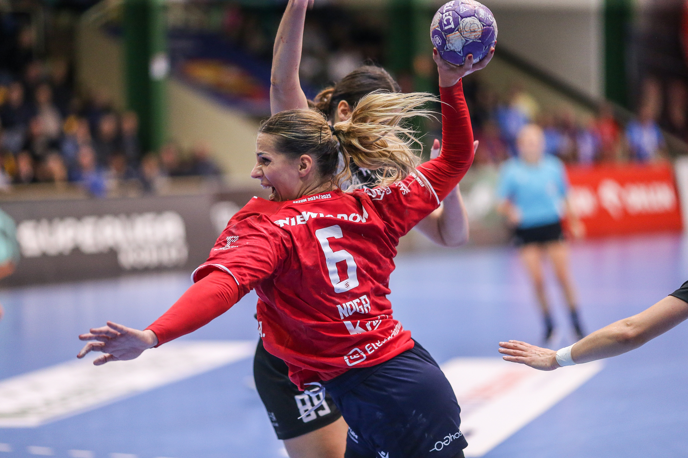 Do dwudziestej minuty żadna z drużyn nie potrafiła wypracować sobie przewagi większej niż dwie bramki, a wynik spotkania oscylował wokół remisu. Ostatni fragment pierwszej połowy przyniósł serię bramek gospodyń, które zasłużenie prowadziły do przerwy 17:13, a wynik tej części gry ustaliła skutecznym rzutem karnym Lucyna Sobecka.