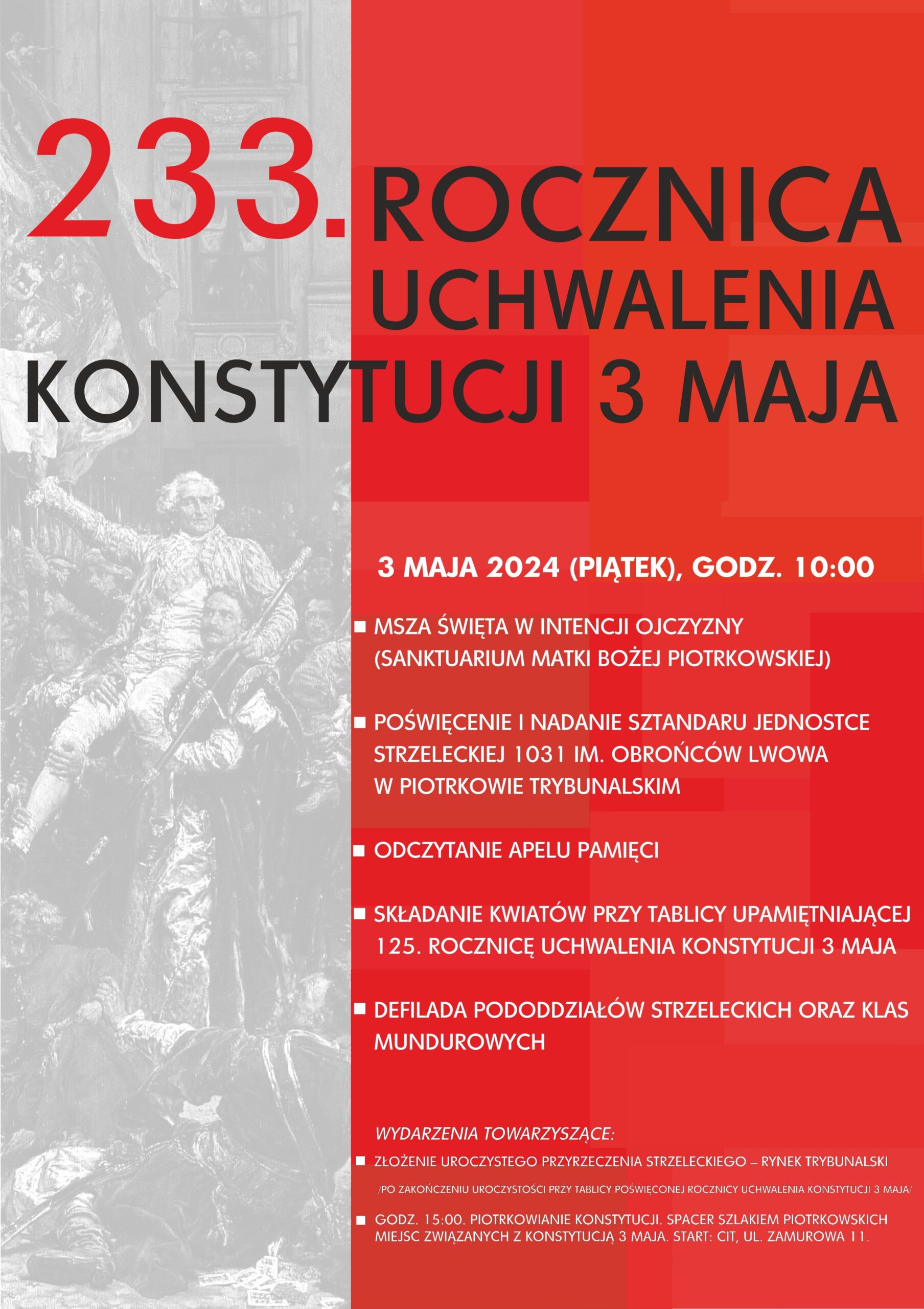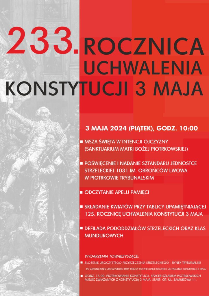 Z okazji 233. rocznicy uchwalenia Konstytucji 3 Maja, będącej jednym z najważniejszych symboli niepodległości Polski zapraszamy na uroczyste obchody uchwalenia pierwszej w Europie i drugiej na świecie ustawy zasadniczej. Uroczystości tradycyjnie rozpoczną się od mszy świętej w intencji Ojczyzny (Sanktuarium Matki Bożej Piotrkowskiej) o godzinie 10:00.