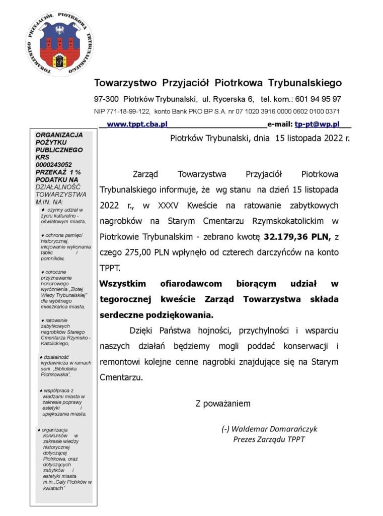 Towarzystwo Przyjaciół Piotrkowa Trybunalskiego wydało komunikat w którym podaje ostateczną kwotę tegorocznej zbiórki. Wynika z niego, że do puszek oraz na konto Towarzystwa trafiło 32.179,36 PLN. To znacznie wyższa kwota, niż ta którą zebrano przed rokiem. – Wszystkim ofiarodawcom biorącym udział w tegorocznej kweście Zarząd Towarzystwa składa serdeczne podziękowania – czytamy.