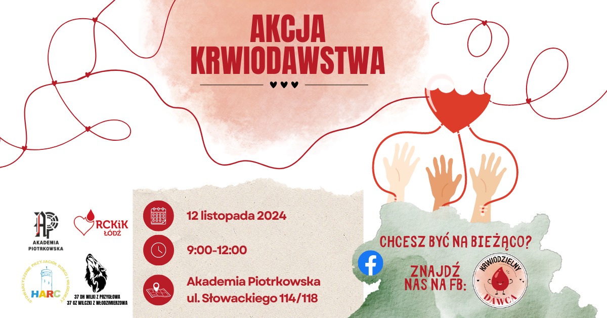 Zbiórka krwi odbędzie się we wtorek 12 listopada w Akademii Piotrkowskiej w godzinach 9:00-12:00. Krew będzie zbierana ze wskazaniem dla dziecka zmagającego się z białaczką, które obecnie walczy o życie. Na krwiodawców, poza możliwością wydłużenia sobie jeszcze bardziej długiego weekendu, czekają także dodatkowe upominki.